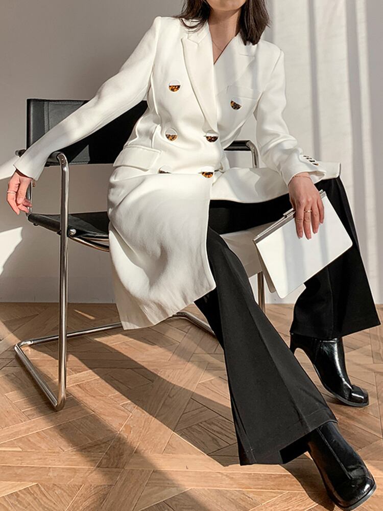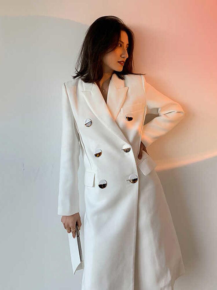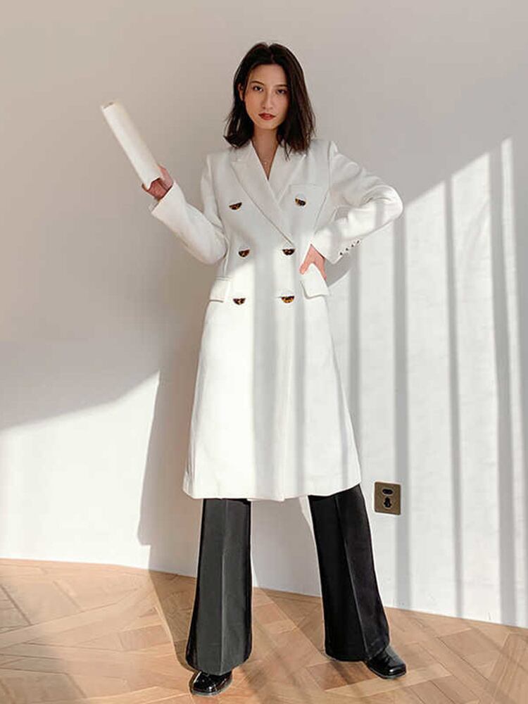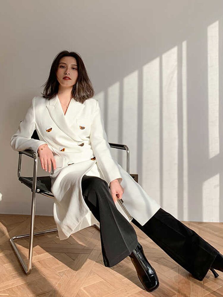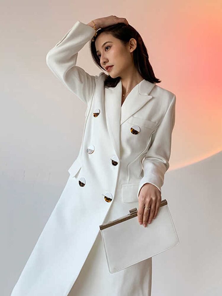 [EWQ] ダブルブレスト白ブレザーコートノッチ長袖ルーズスーツジャケット春秋潮服 ロング ホワイト スプリング 春物 オータム 秋物