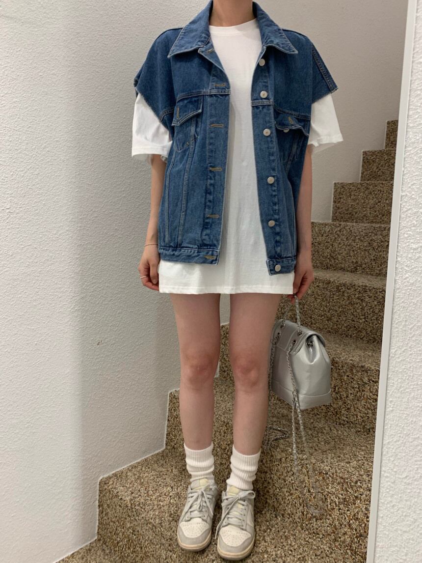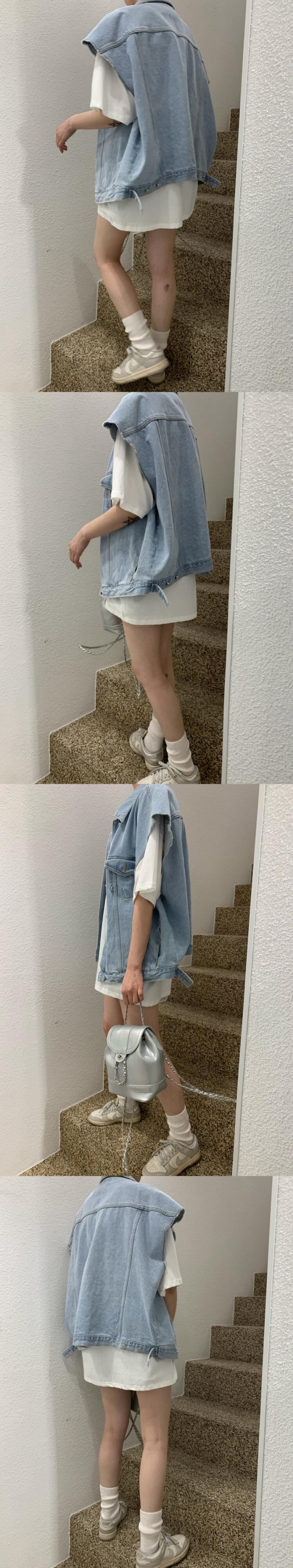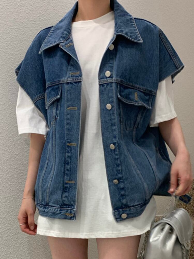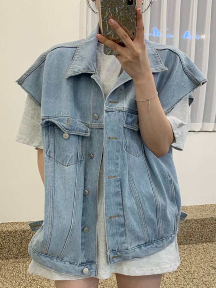 [EWQ] シングルブレストライトブルーデニムベストルーズノースリーブジャケット夏潮ラペル因果包帯チョッキトップ サマー 夏物