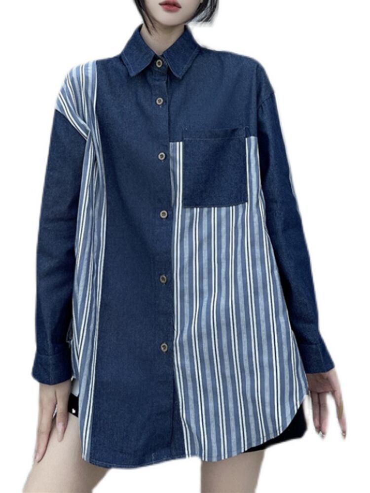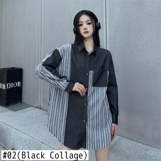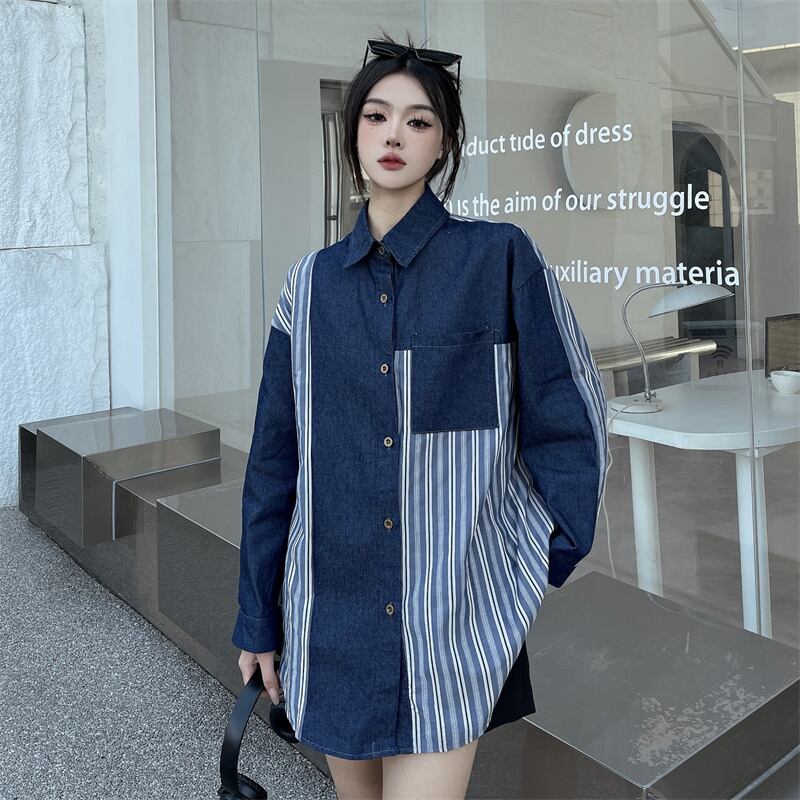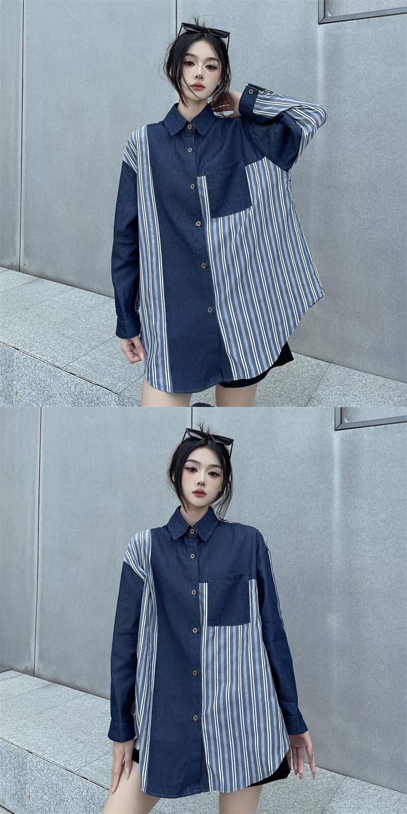 [EWQ] ストリートデニムパッチワークシャツコントラストカラーストライプポケットオーバーサイズ長袖ブラウス夏潮トップ ロング サマー 夏物