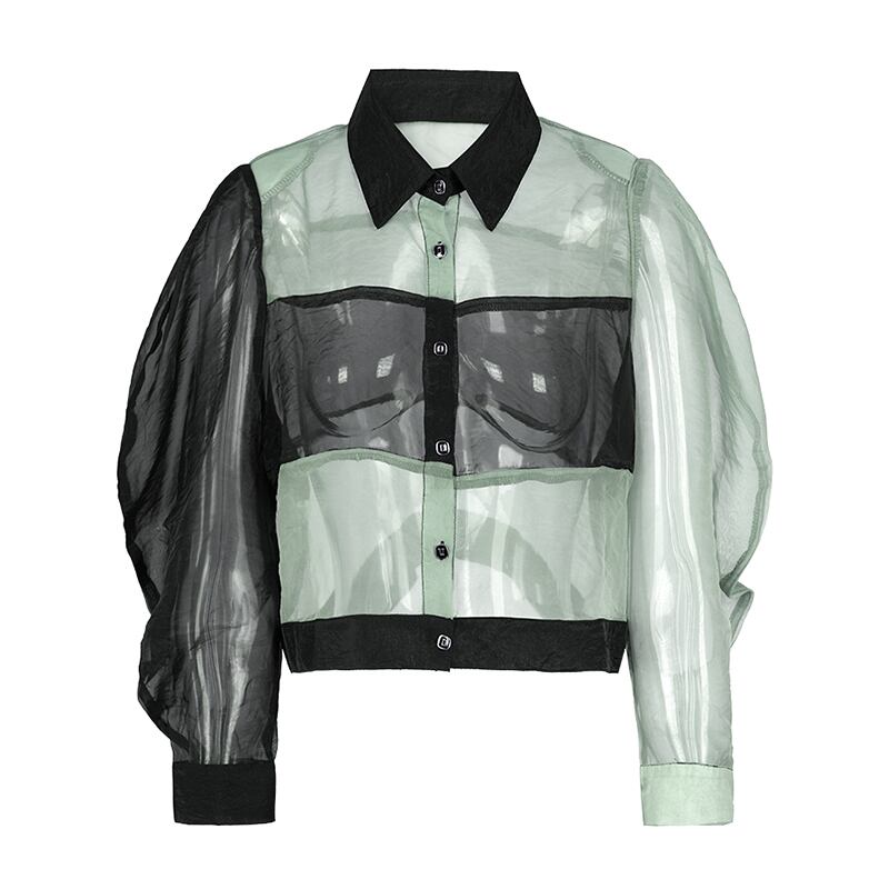 [EWQ] レディース パースペクティブ シャツ レディース 長袖 パッチワーク シングルブレスト メッシュ ブラウス トップス 夏潮 ロング サマー 夏物