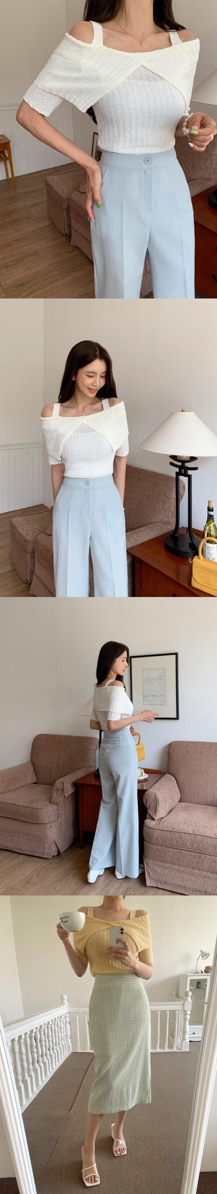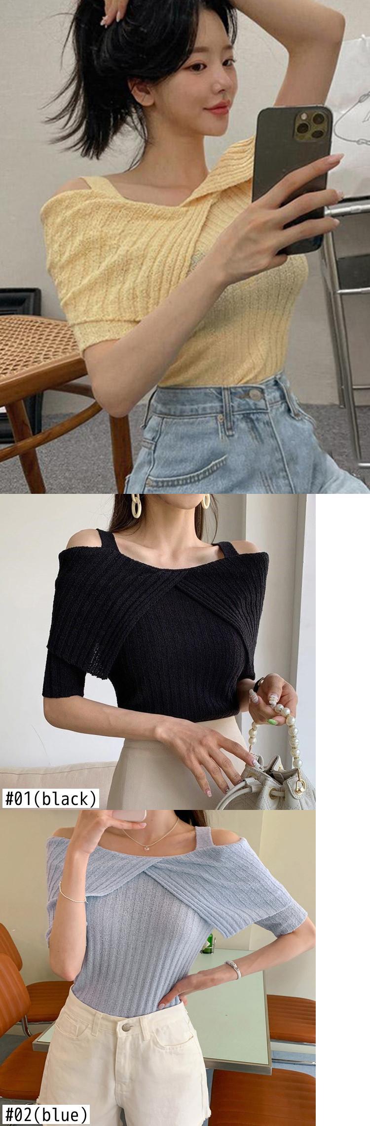 [EWQ] セクシースラッシュネックオフショルダーニット Tシャツショール弾性ソリッドカラー半袖ニットトップ夏潮 ショート ハーフスリーブ エラスティック 伸縮 サマー 夏物