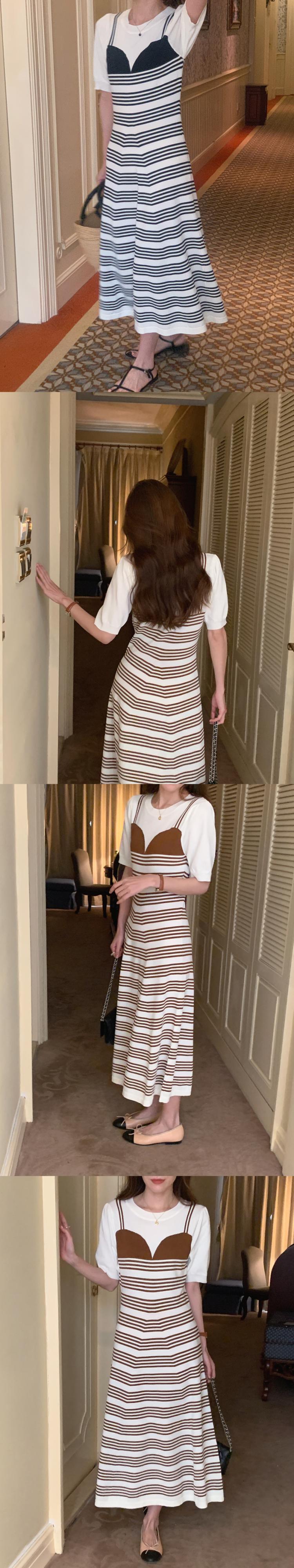 [EWQ] ストライプフェイクツーピースドレス O ネックコントラストカラーミディドレス夏潮 Vestido 16Y8241 サマー 夏物 Oネック