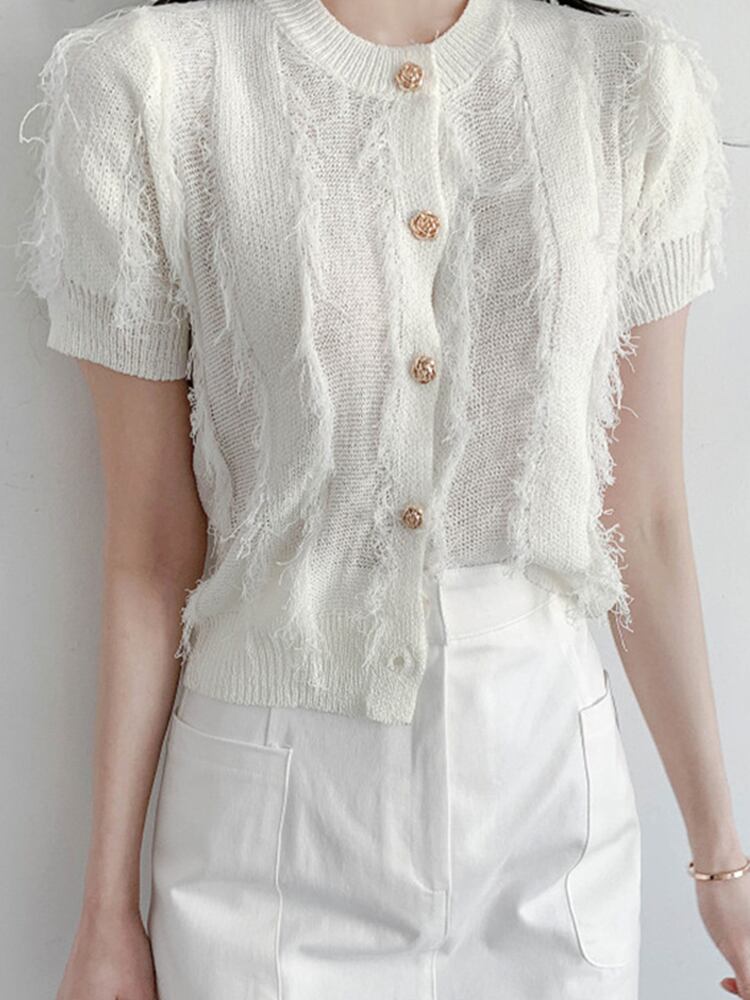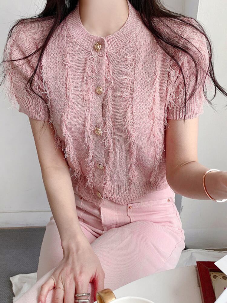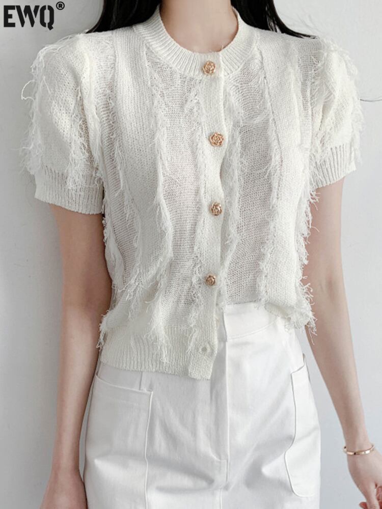 [EWQ] メタルボタンテルニット Tシャツバブルスリーブ Tシャツトップ夏潮優しい気質トップス サマー 夏物