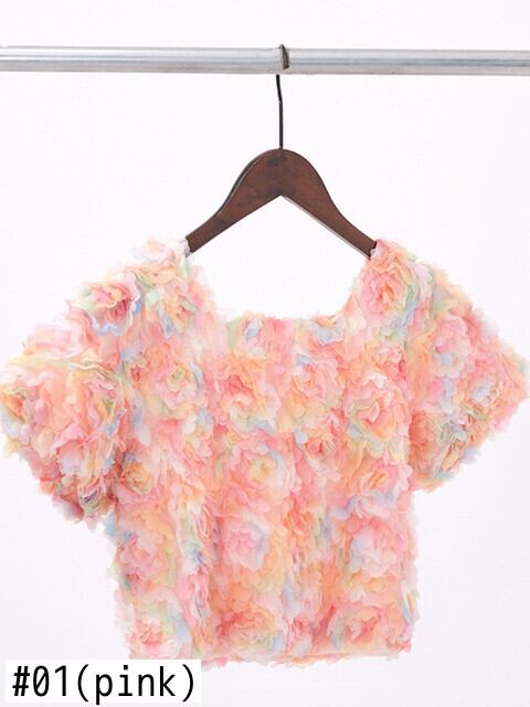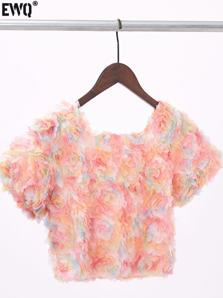 [EWQ] 甘いカラフル 3D フラワーシャツコントラストカラースクエアネックショートトップ夏美しいブラウス潮 大人ガーリー スウィート キュート カジュアル サマー 夏物 フラワーデザイン スクウェア