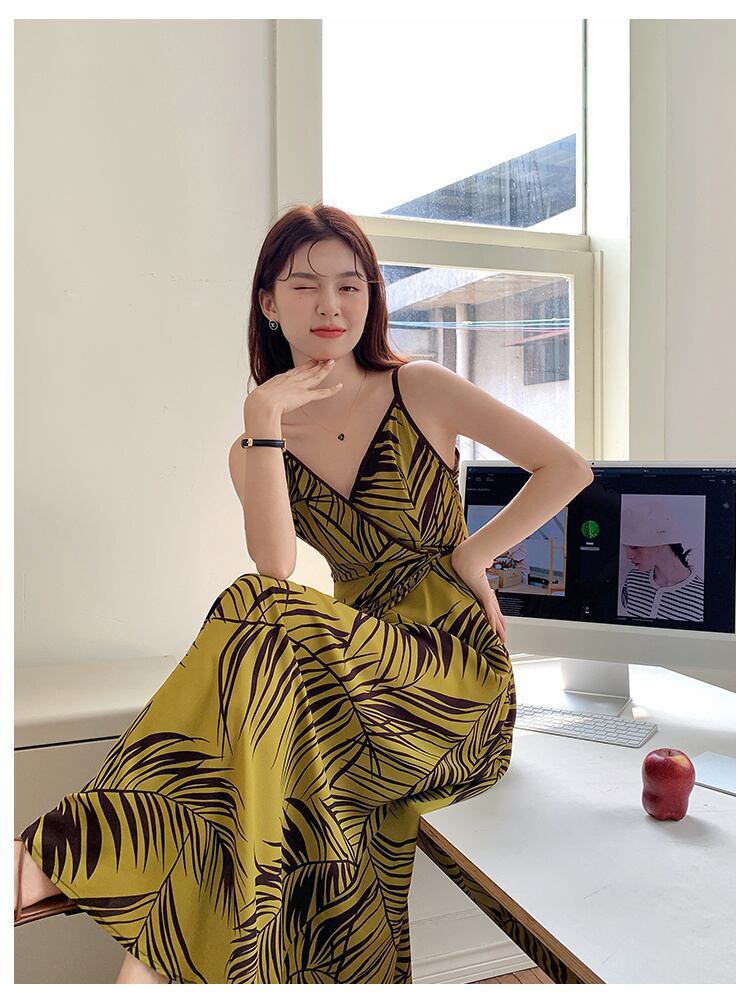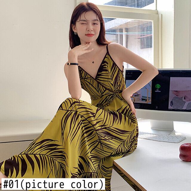 [EWQ] V ネック花柄スリングドレススリムウエストコントラストノースリーブドレス夏潮 9547 サマー 夏物 Vネック