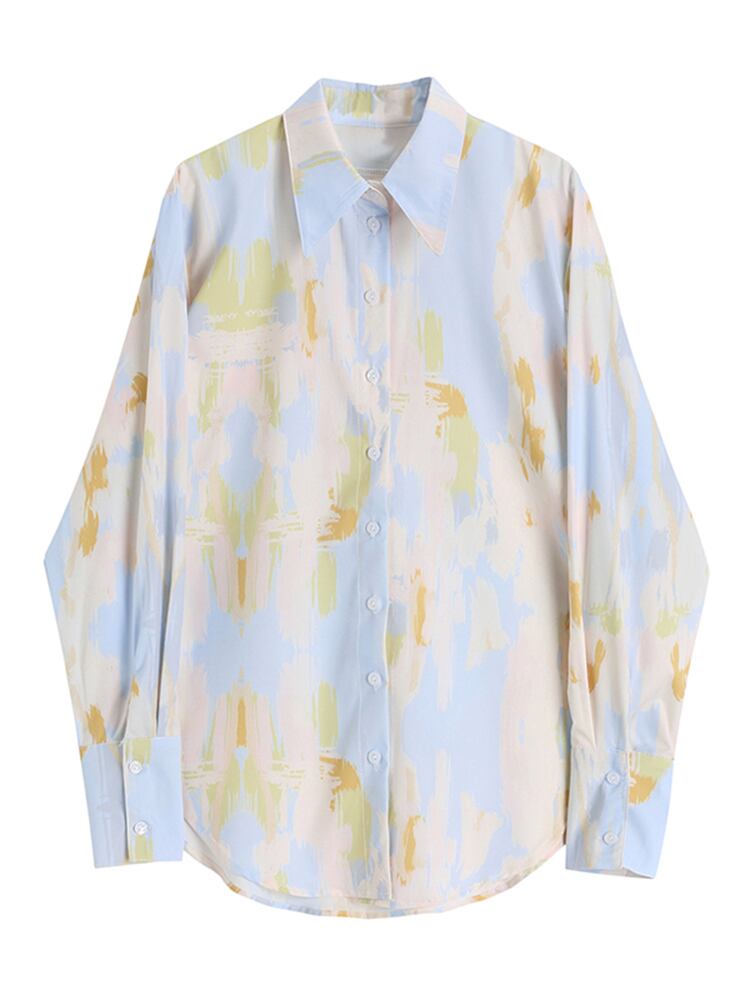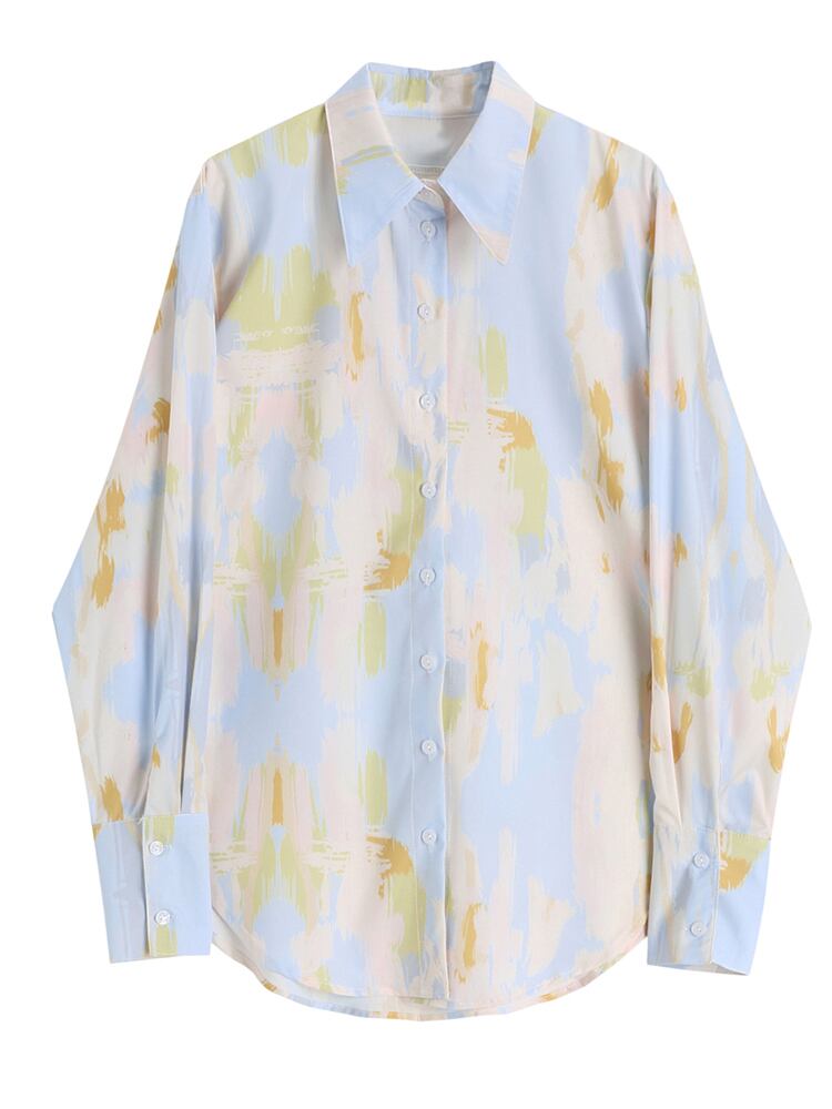 [EWQ] 長袖プリントシャツシングルブレストルーズカジュアルコントラストカラートップスサマータイドブラウス ロング 夏物