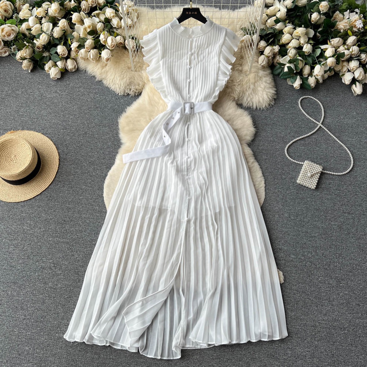 [EWQ] シフォンレースアップドレスフリルスプライスソリッドカラースタンドネックプリーツシングルブレストドレス夏赤ローブ レッド サマー 夏物