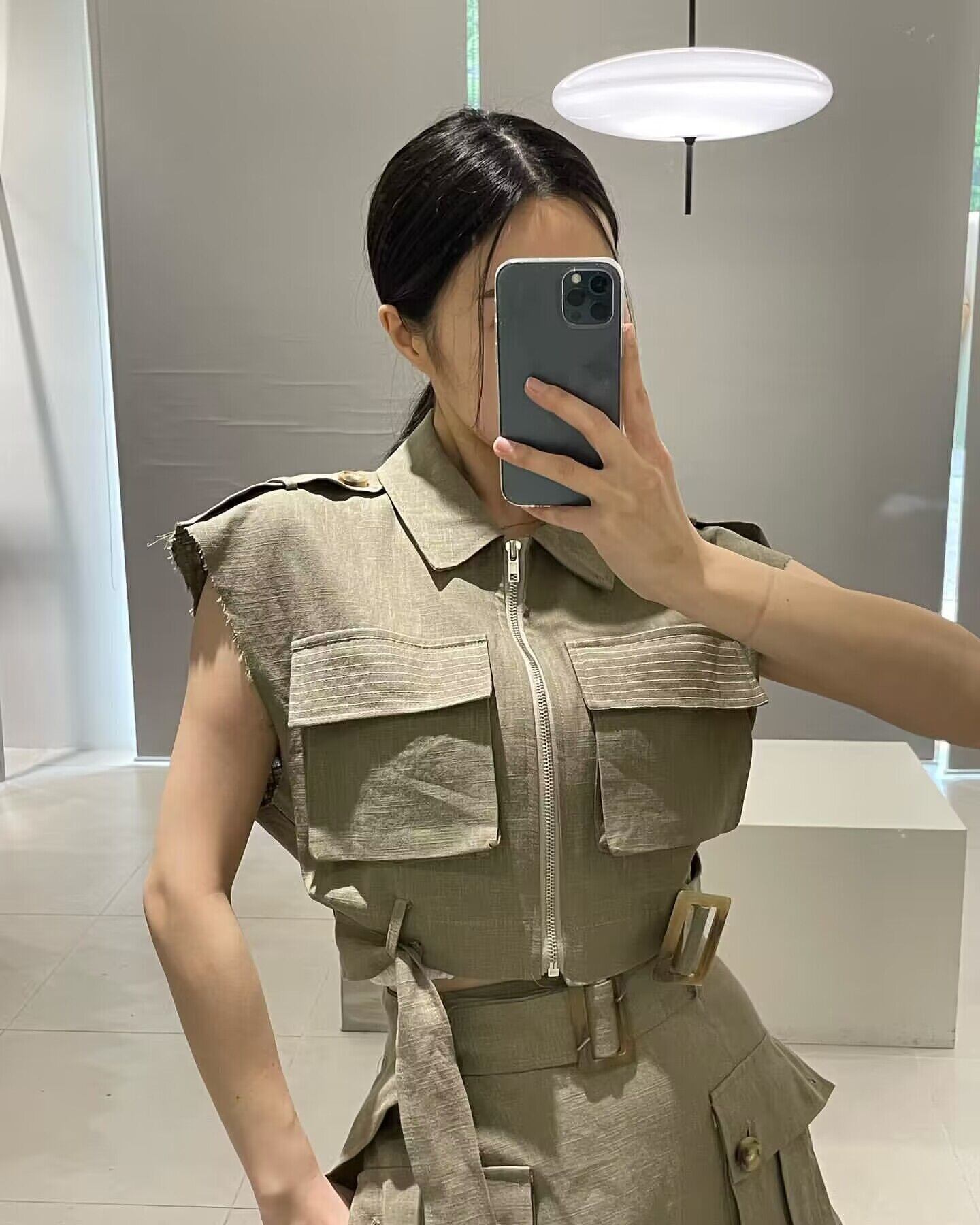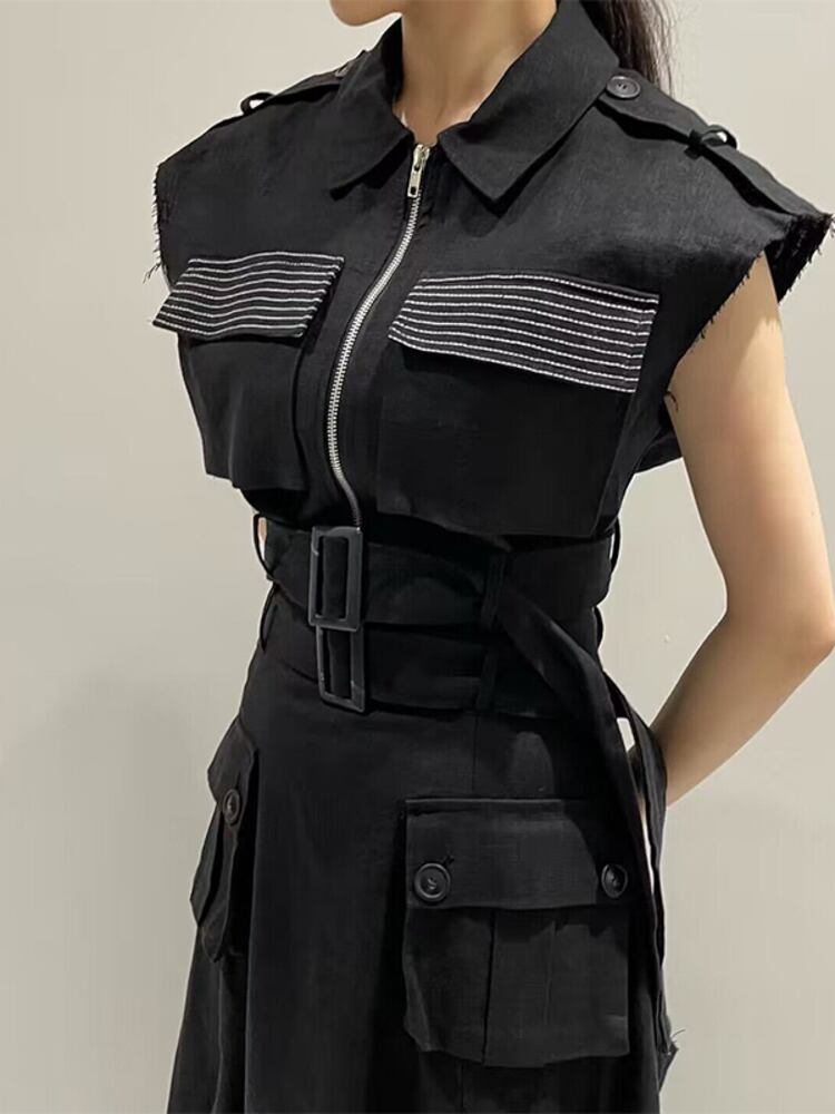 [EWQ] スーツジッパーノースリーブジャケットベスト + ウエストレースアップ分割ポケットミッドふくらはぎスカート夏潮ストリート サマー 夏物
