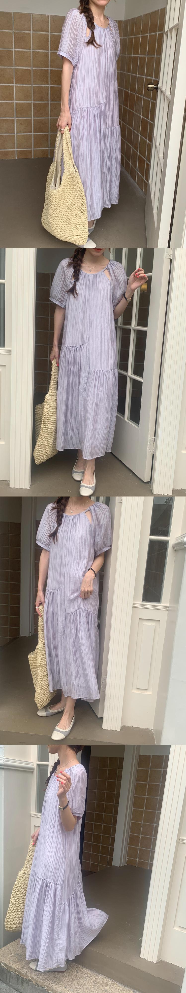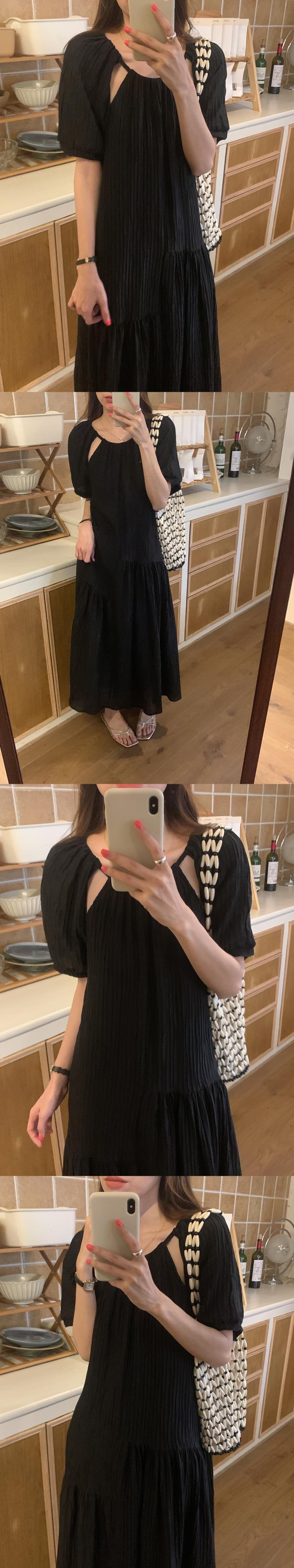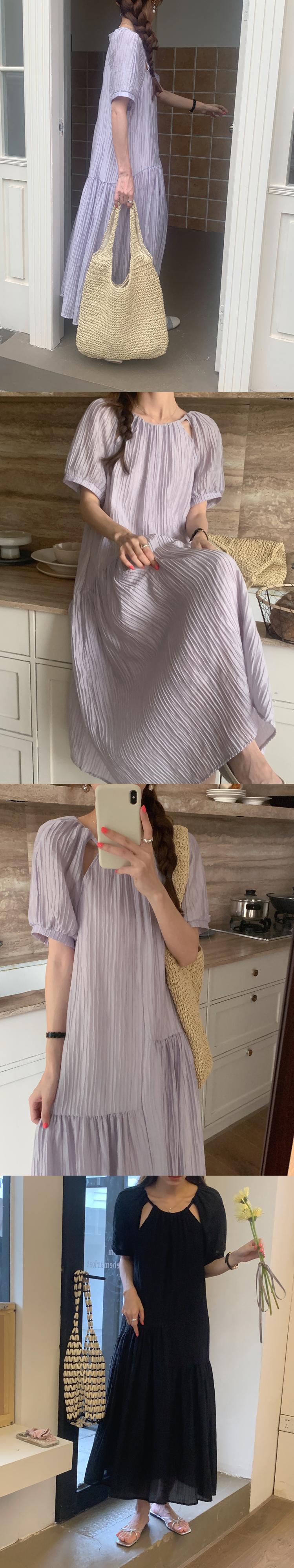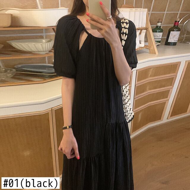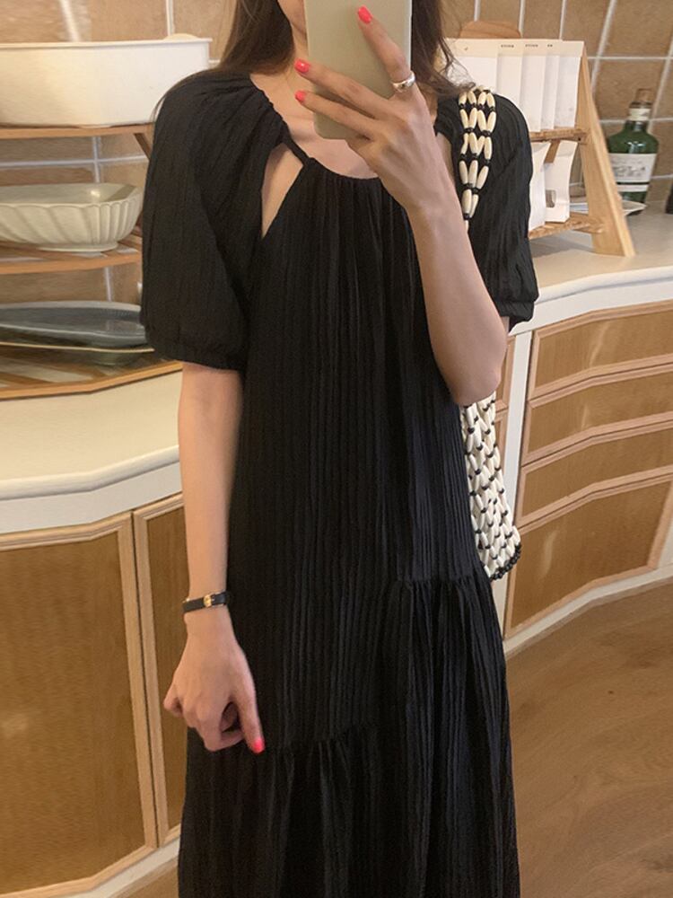 [EWQ] O ネック中空アウトドレスプリーツフリルスプライスソリッドカラールーズカジュアルロングドレス夏潮 Vestidos サマー 夏物 Oネック