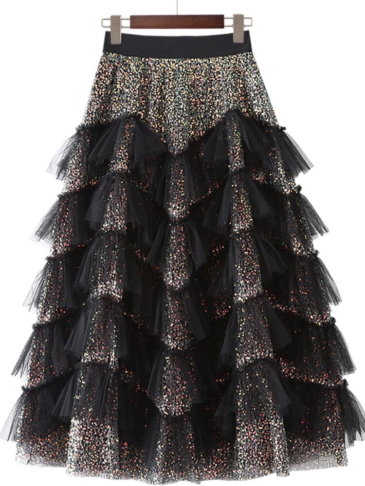 [EWQ] ガーゼスカートスパンコール刺繍メッシュフリルスプライスウエスト弾性 A ラインスカート夏段段 エラスティック 伸縮 サマー 夏物 Aライン