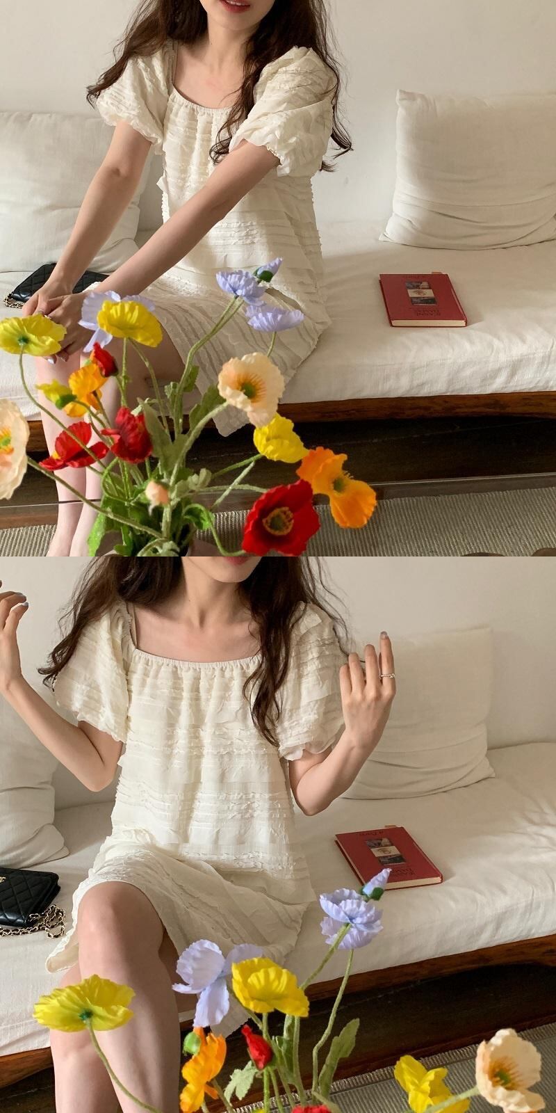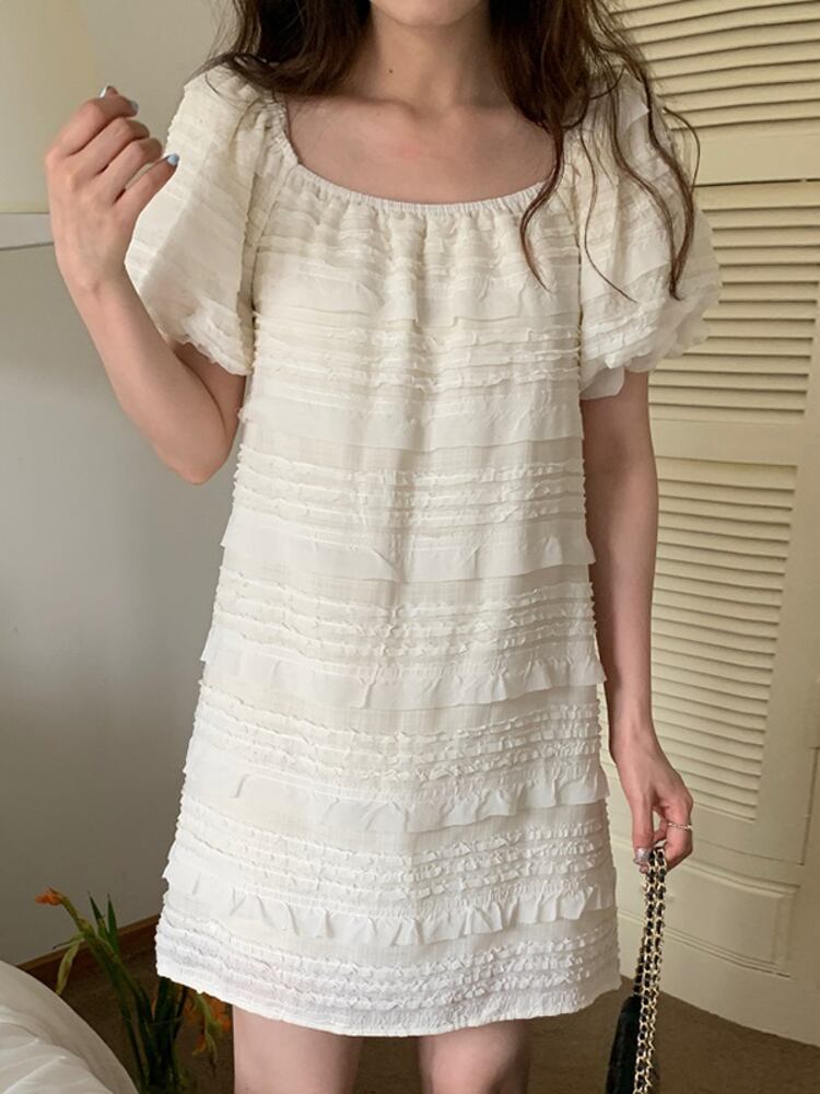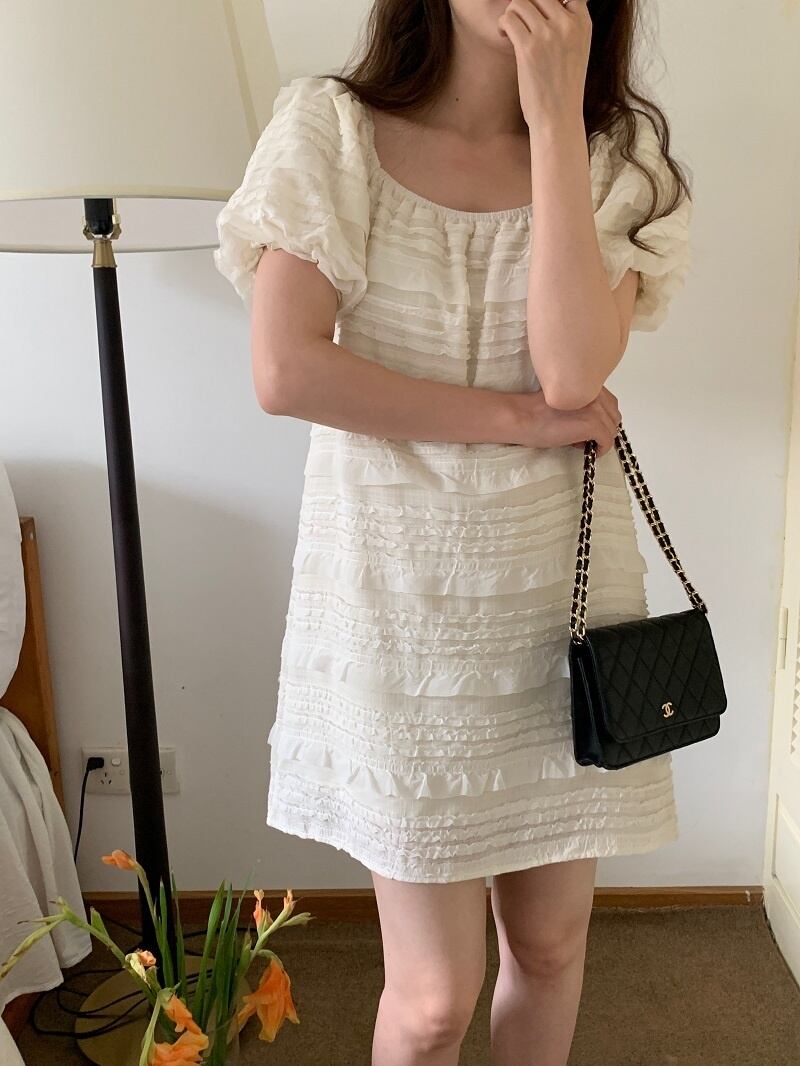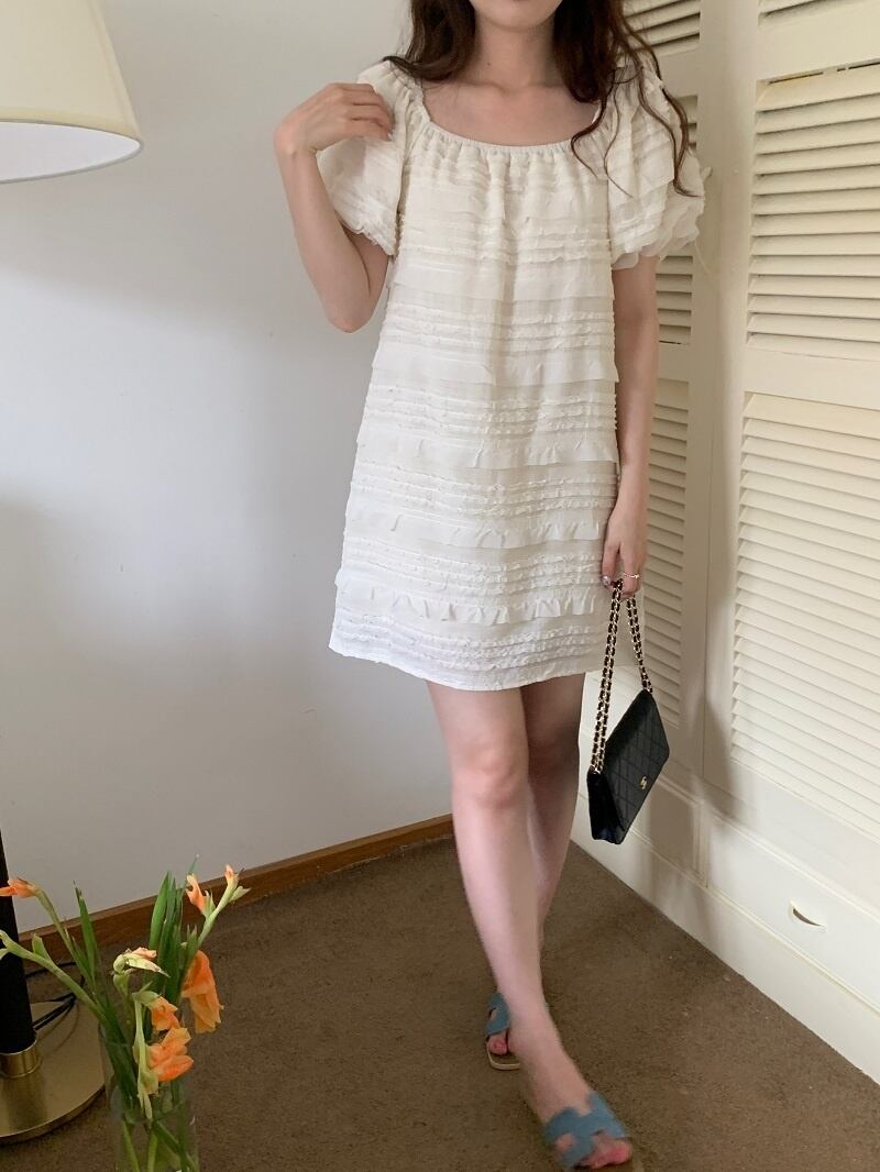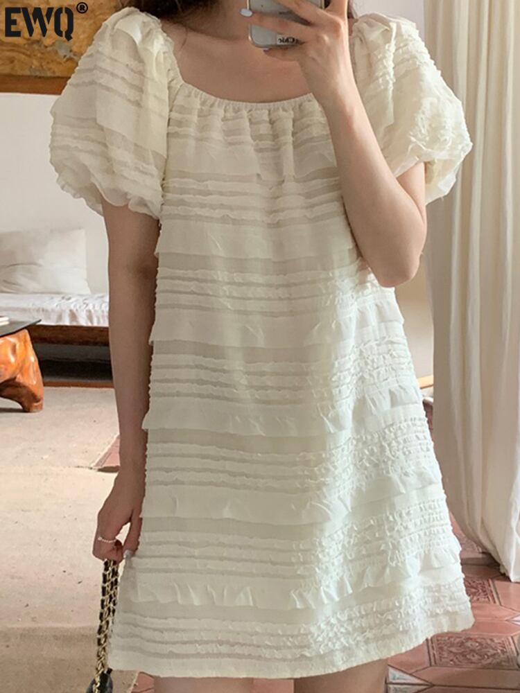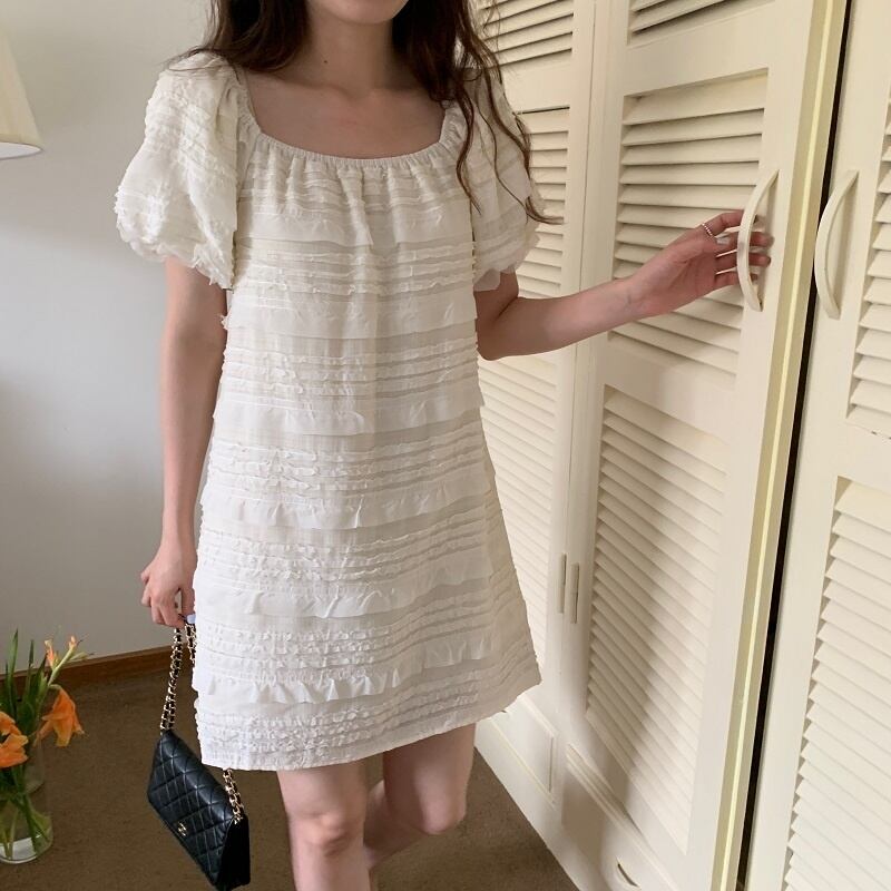 [EWQ] スクエアネックドレスレースフックフラワースプライシングパフスリーブショートドレス夏潮 Vestido 770 サマー 夏物 フラワーデザイン スクウェア