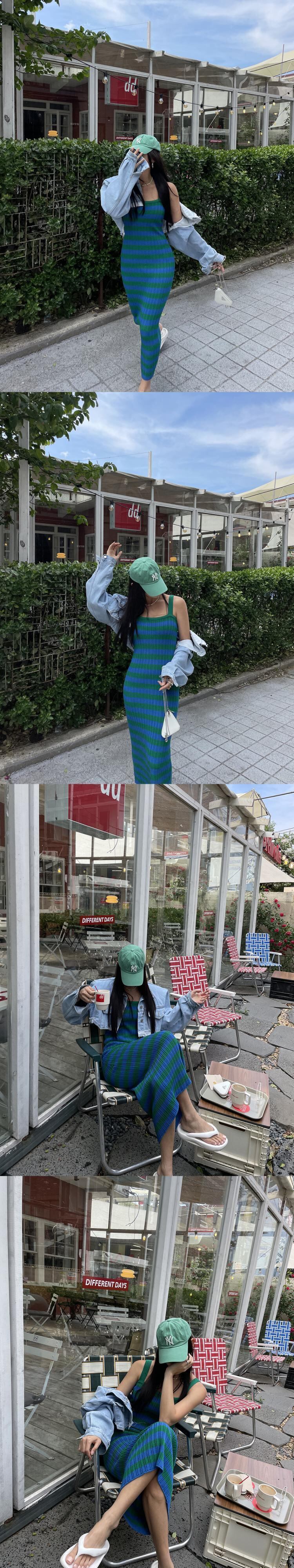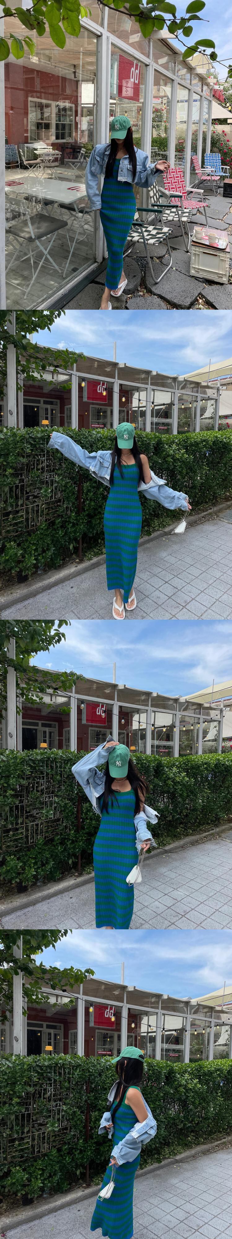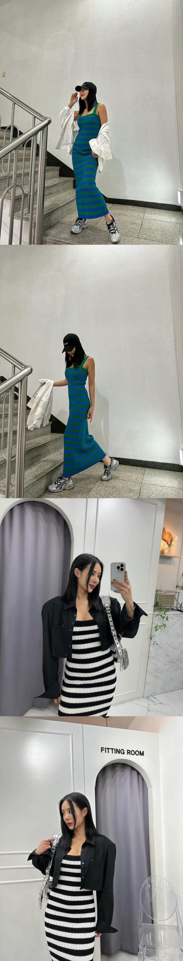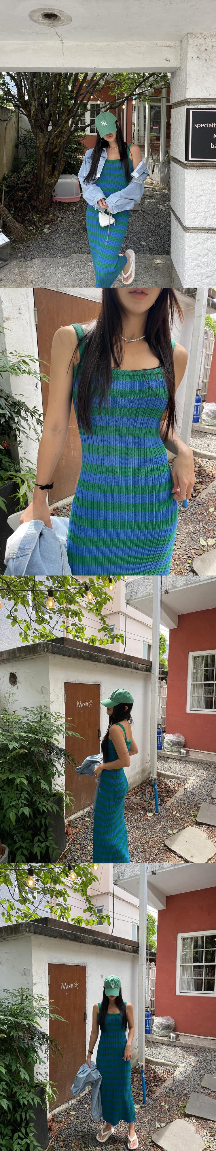 [EWQ] ニットドレススクエアネックコントラストストライプジャカードスリムフィットノースリーブラップヒップニットドレス夏 961 サマー 夏物 スクウェア