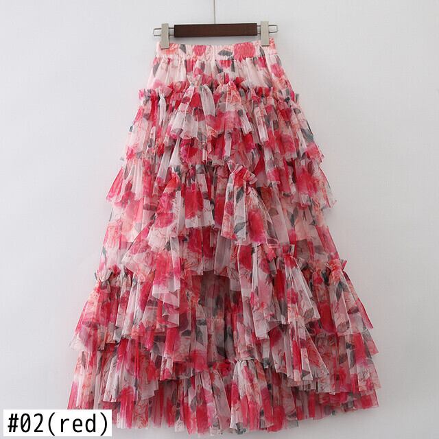 [EWQ] パープルメッシュスカートウエストコントラストカラーティアードフリルスプライス A ラインガーゼスカート夏 レッド サマー 夏物 Aライン