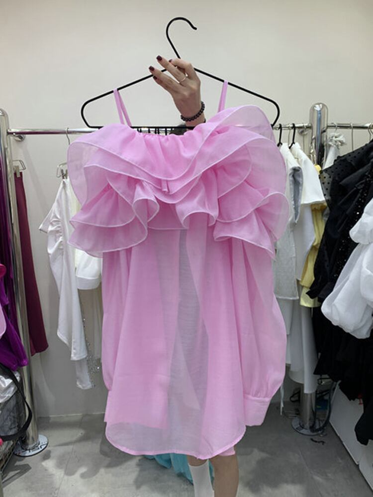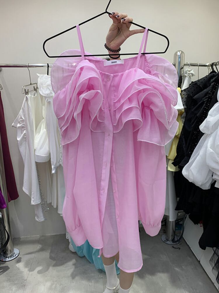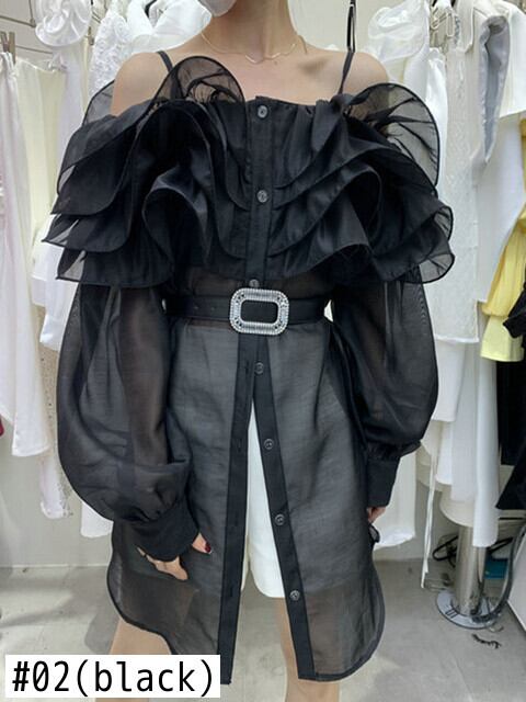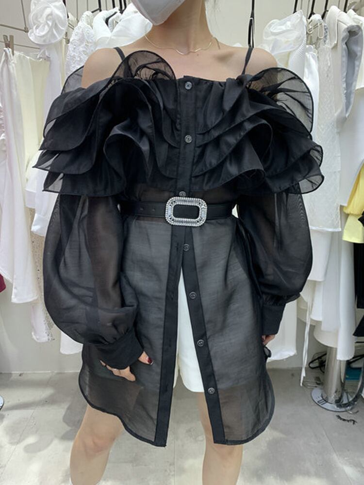 [EWQ] オフショルダーフリルスプライスメッシュシャツシングルブレストレースアップブラウストップ夏潮薄いトップス サマー 夏物