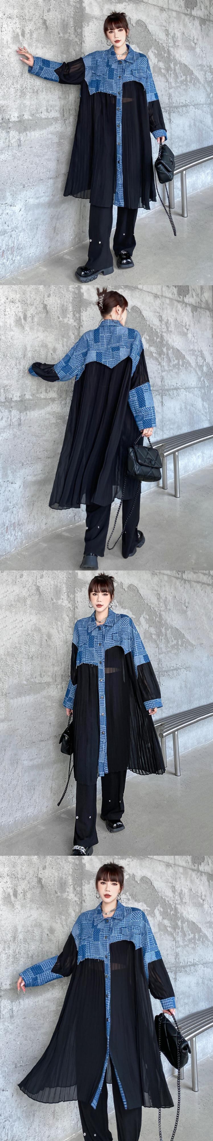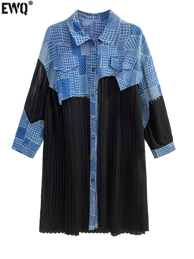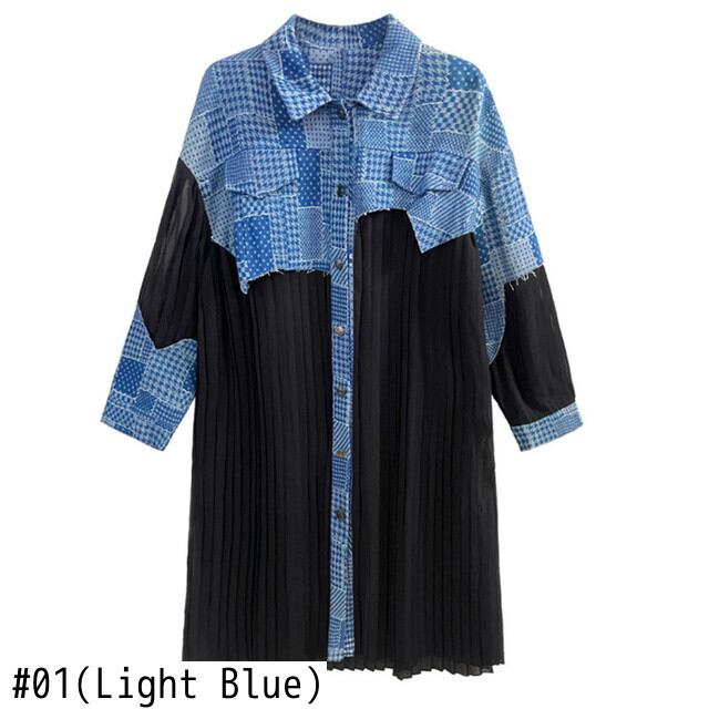 [EWQ] ブルーチェック柄プリーツロングビッグサイズシャツドレスラペル長袖ルーズフィットシャツ春秋 1Y925 スプリング 春物 オータム 秋物