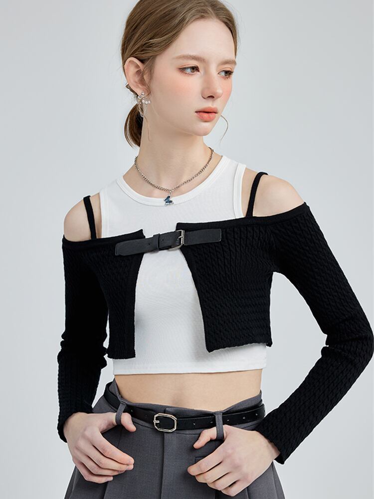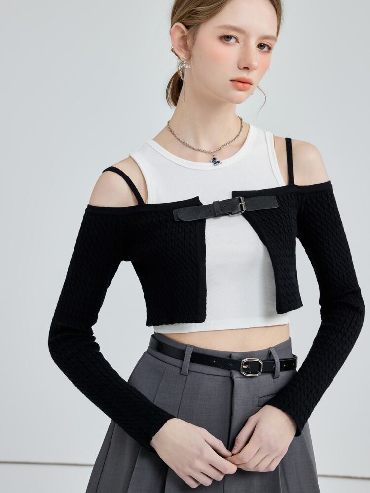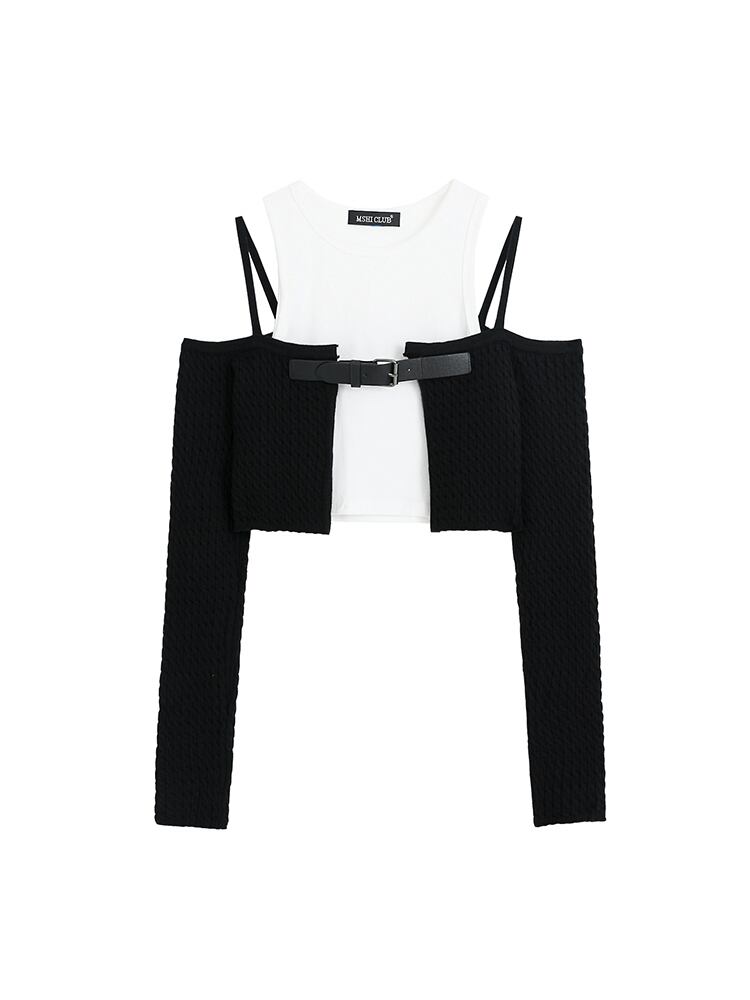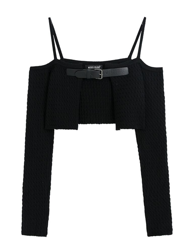 [EWQ] セクシーオフショルダーストラップタンクトップベルトバックル長袖ベスト夏潮服 9486 ロング サマー 夏物 ハーネス