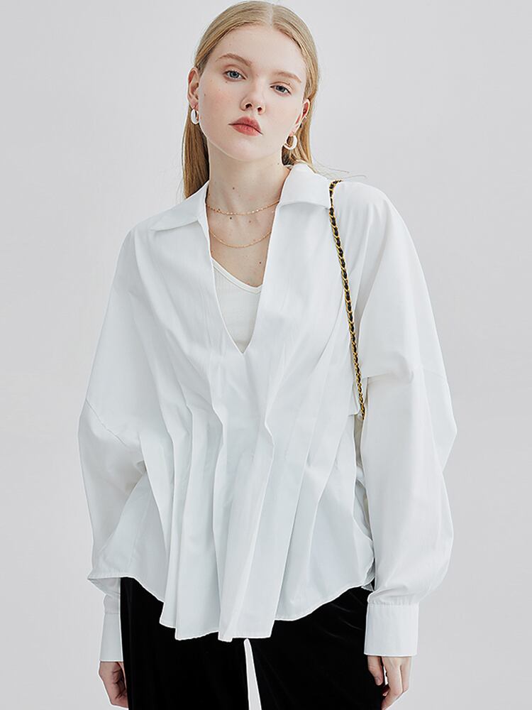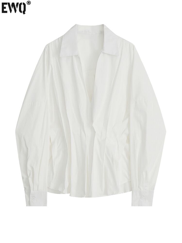 [EWQ] プリーツウエスト白シャツ長袖 V ネックルーズオフィスレディトップス夏潮ブラウス 6Y9481 ロング ホワイト サマー 夏物 Vネック 会社 学校 通勤や通学にも