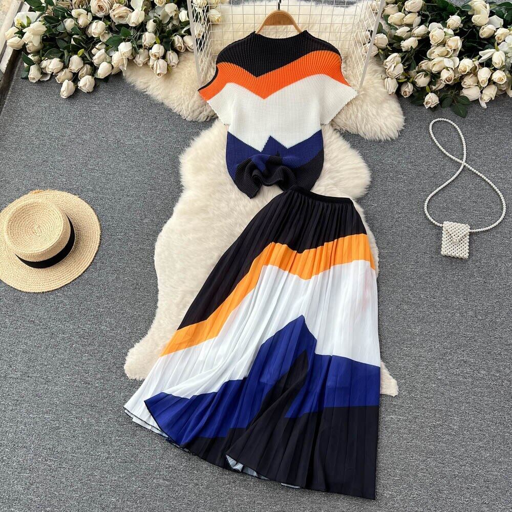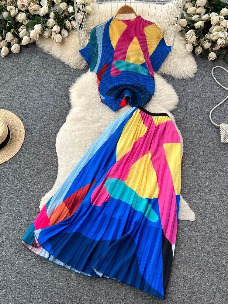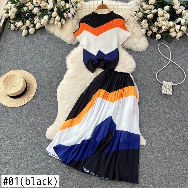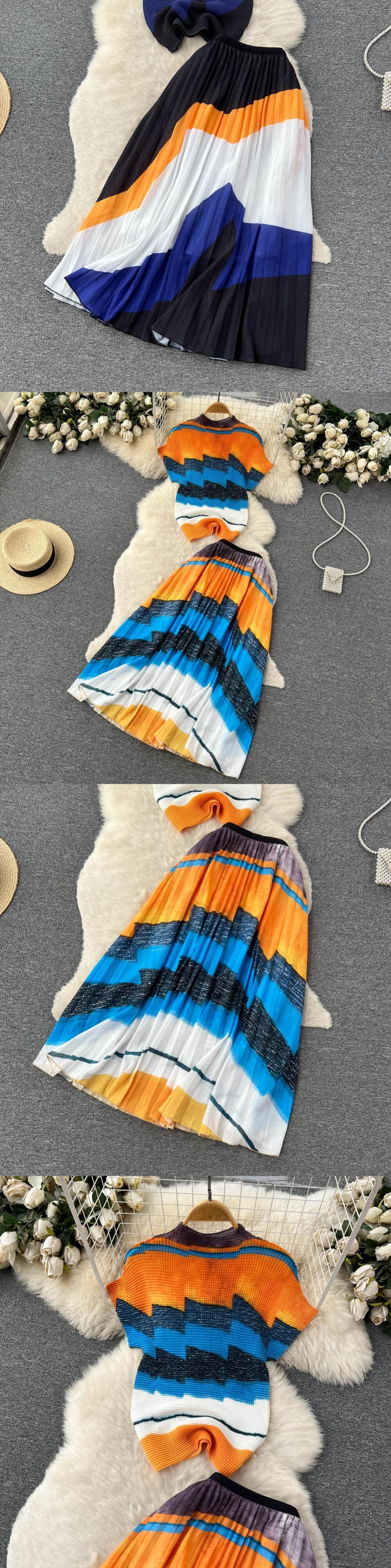[EWQ] セットプリーツプリントトップ + ウエストスリムひだコントラストカラー A ラインスカート夏潮ツーピーススーツ サマー 夏物 Aライン