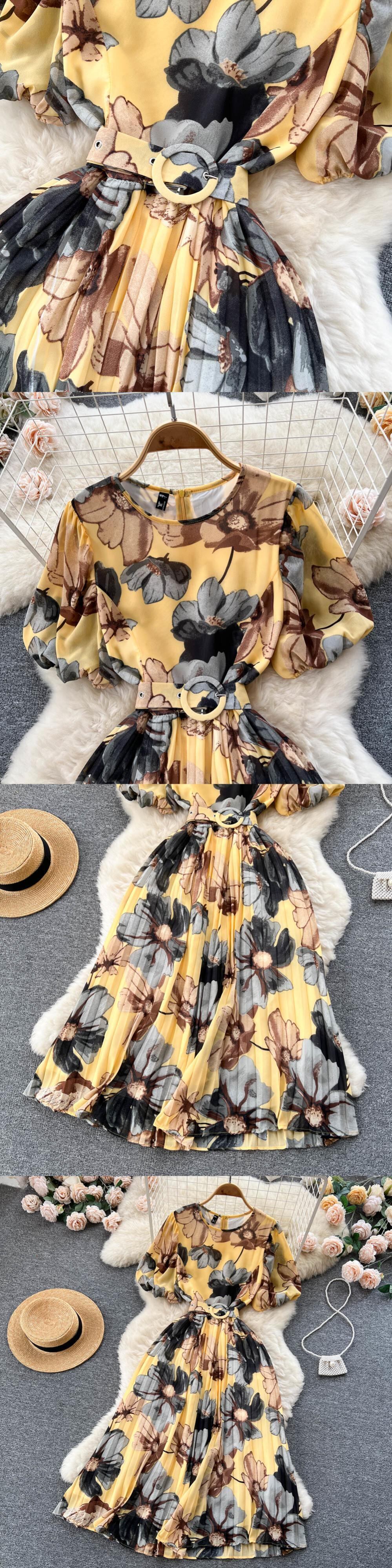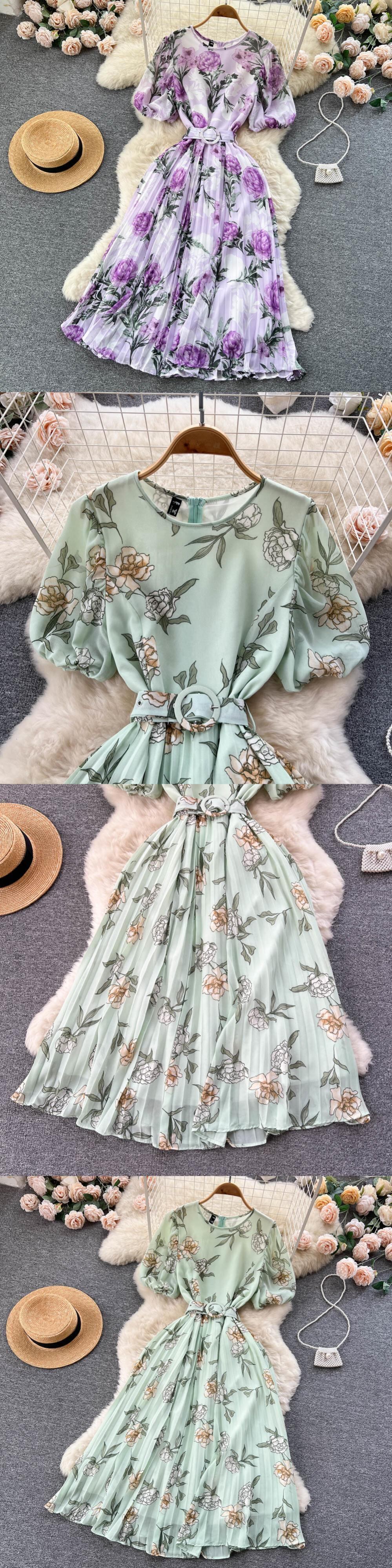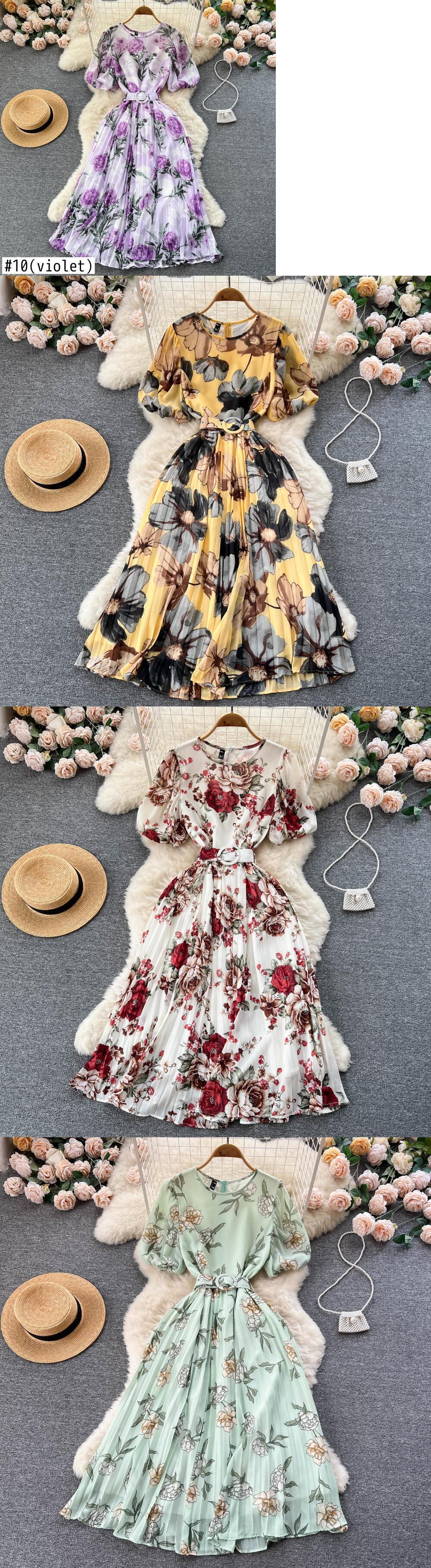 [EWQ] 花柄ドレスコントラストカラーパフスリーブ O ネックレースアップドレス夏潮気質 Vestido 9375 サマー 夏物 Oネック
