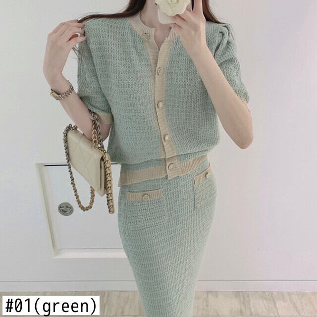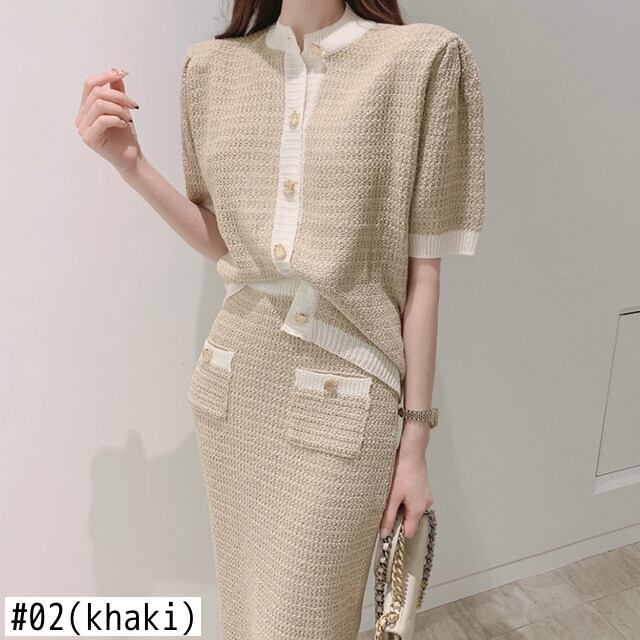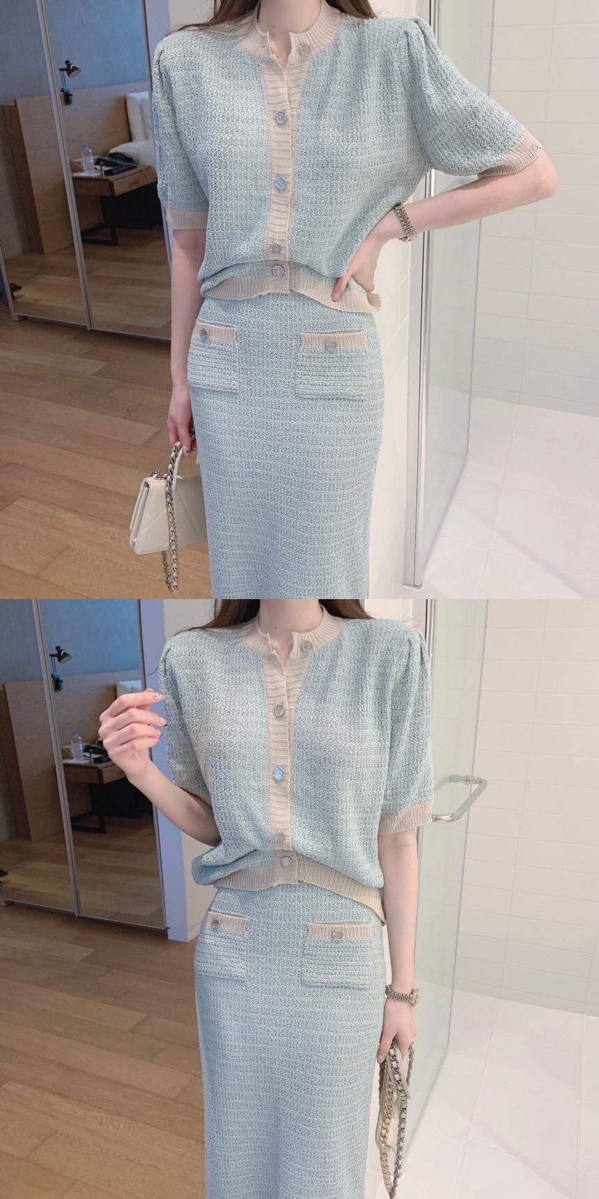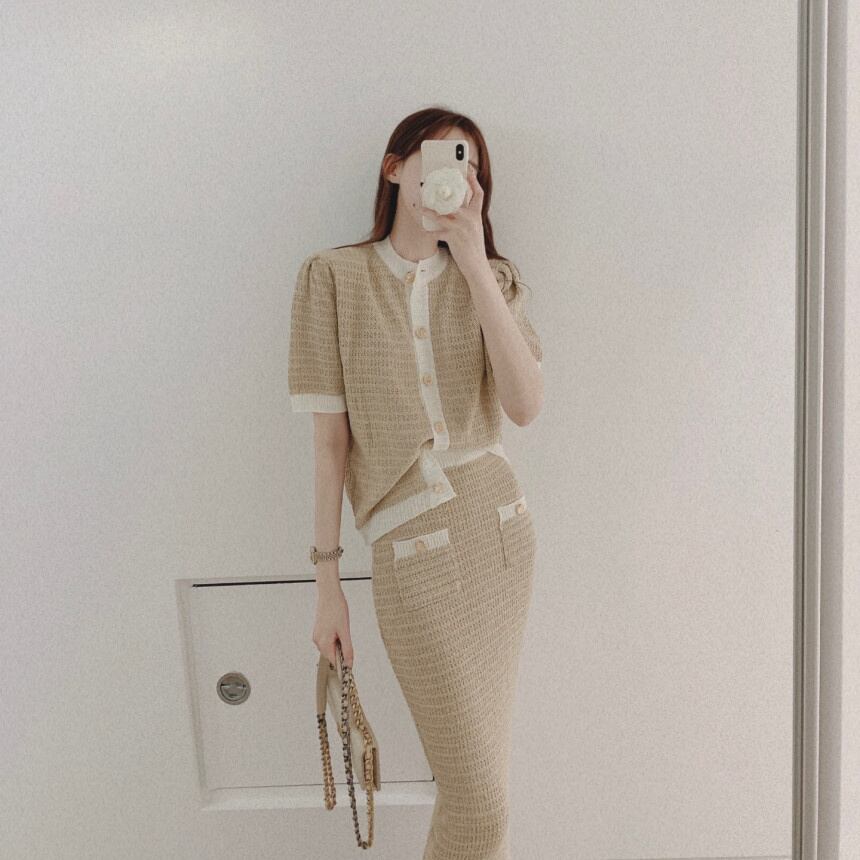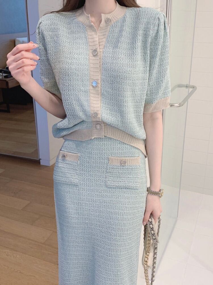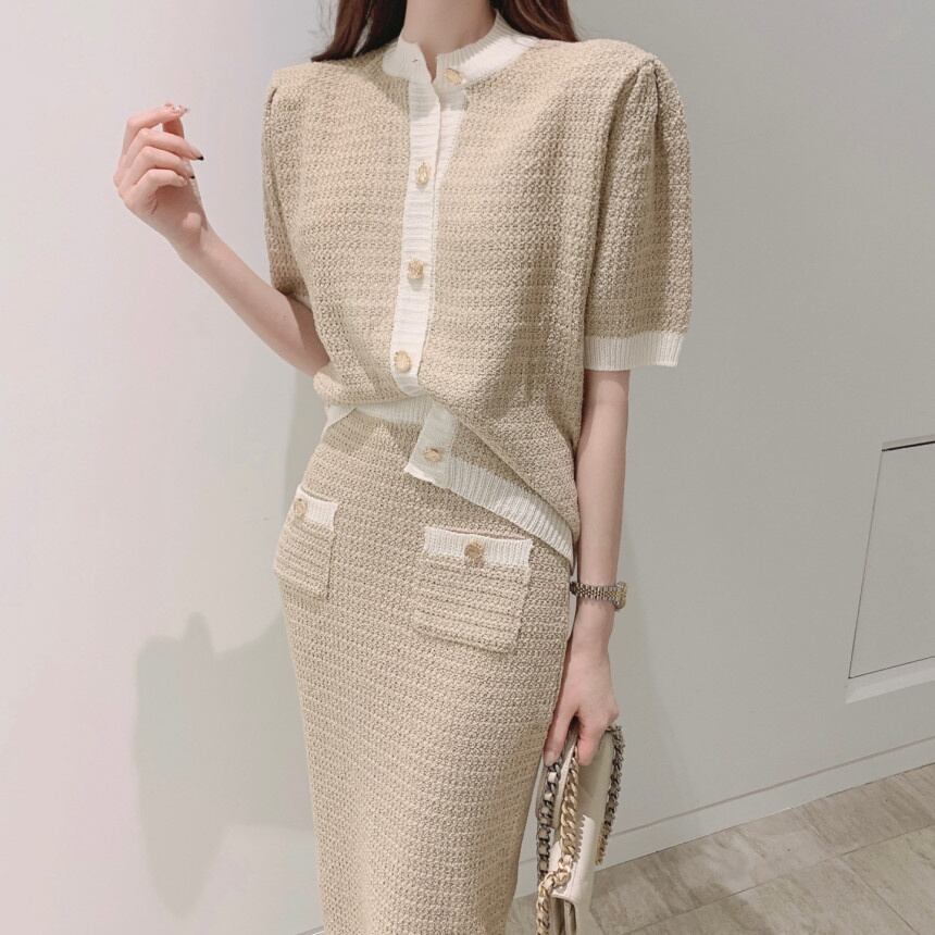 [EWQ] ツーピーススーツシンプル O ネックコントラストニットシャツ + ウエストスリムラップヒップスカート夏潮 サマー 夏物 Oネック