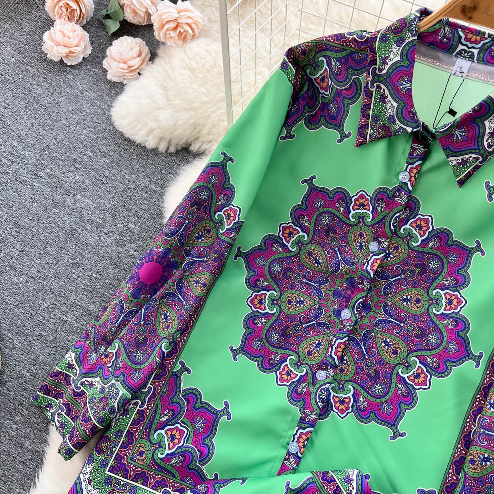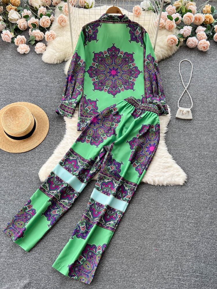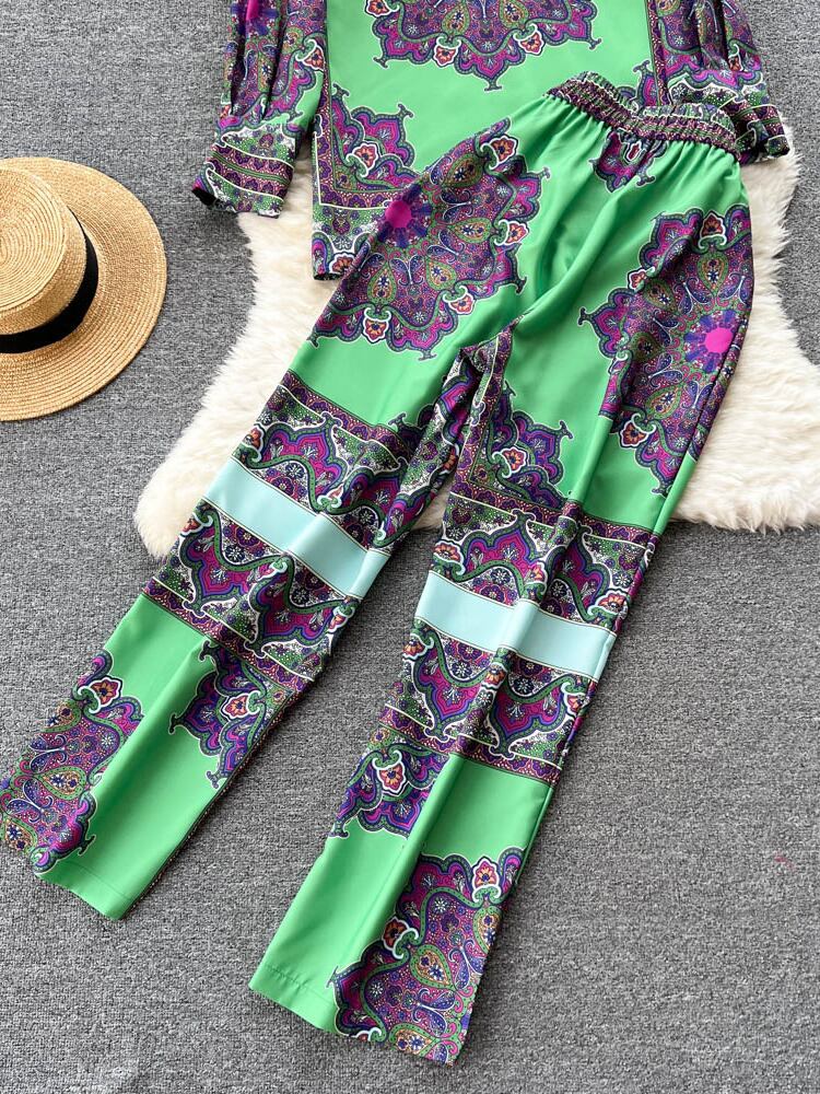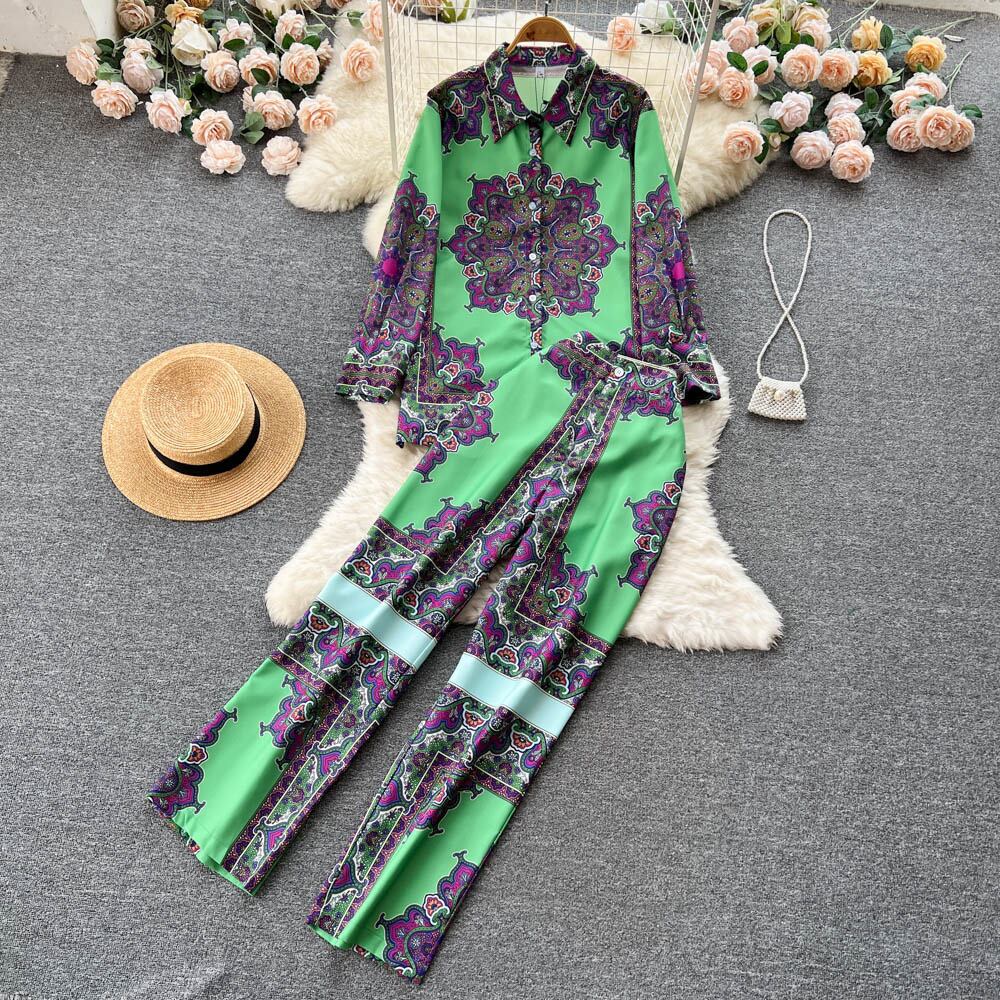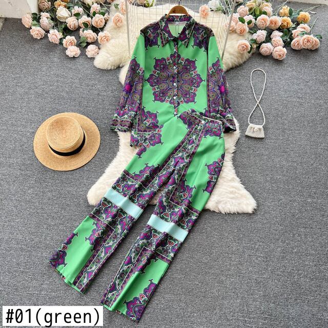 [EWQ] 有能セット長袖プリントシャツワーシト弾性ワイドレッグパンツ夏潮ツーピーススーツ Y9371 ロング エラスティック 伸縮 サマー 夏物 ワイドパンツ