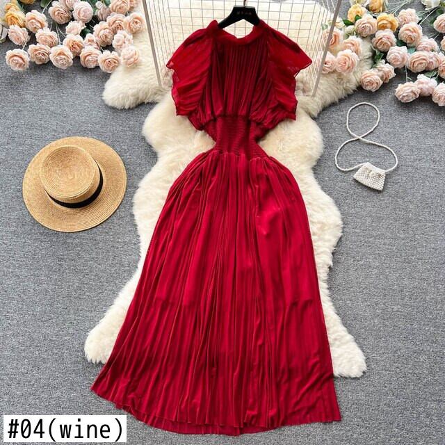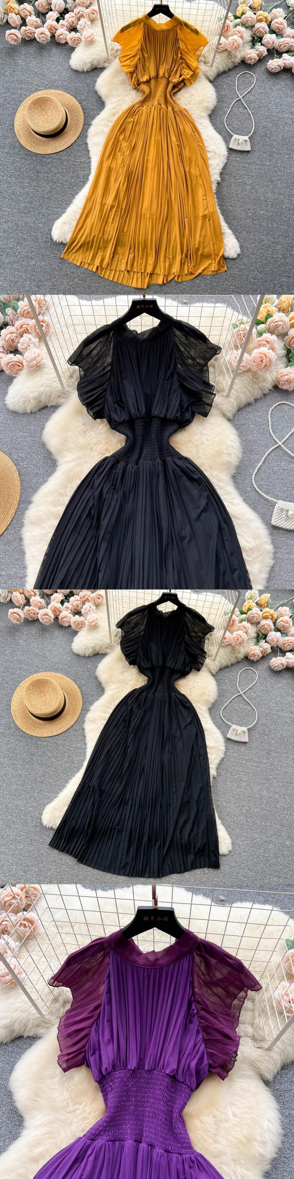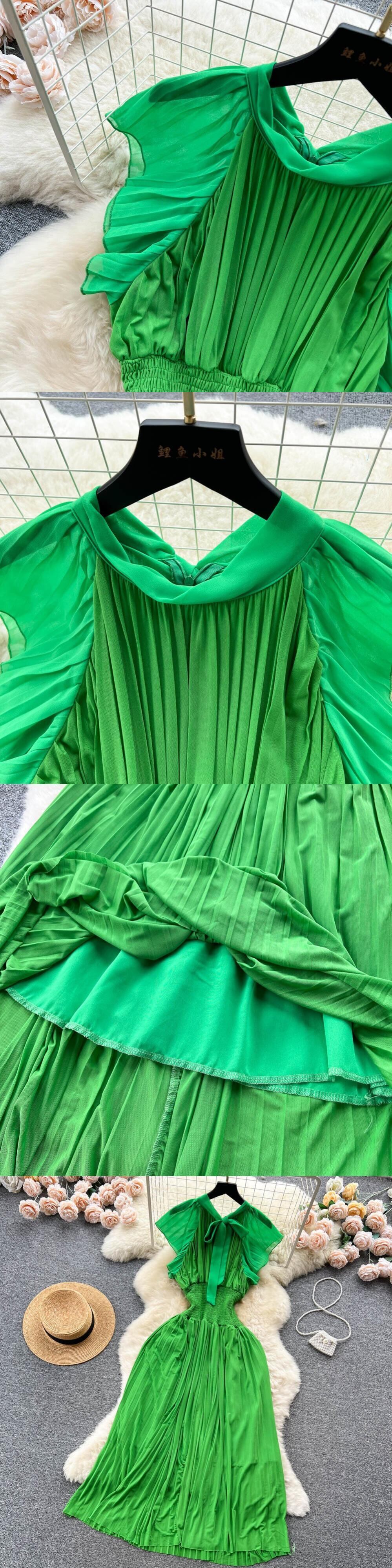 [EWQ] 弾性ウエストグリーンメッシュドレスフライングスリーブプリーツ O ネック気質ドレス夏潮ローブ エラスティック 伸縮 サマー 夏物 Oネック
