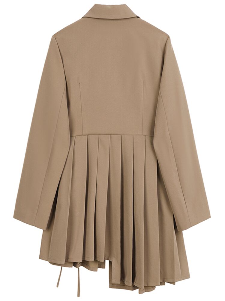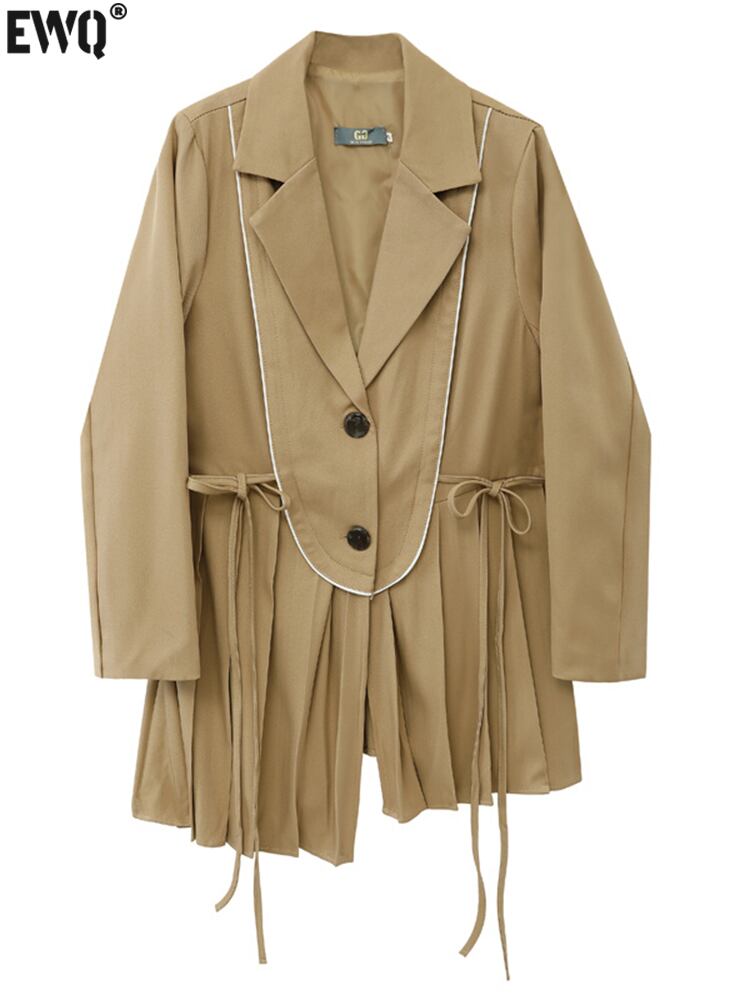 [EWQ] ちょう結びブレザーコート夏潮カーキ長袖ラインコントラスト不規則プリーツスーツジャケットトップ ロング リボン サマー 夏物