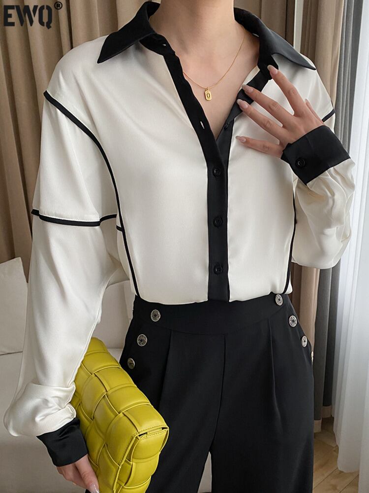 [EWQ] レディース コントラストカラーラインシャツ長袖パッチワークブラウスシンプルレディーストップス春潮ホワイト ロング スプリング 春物