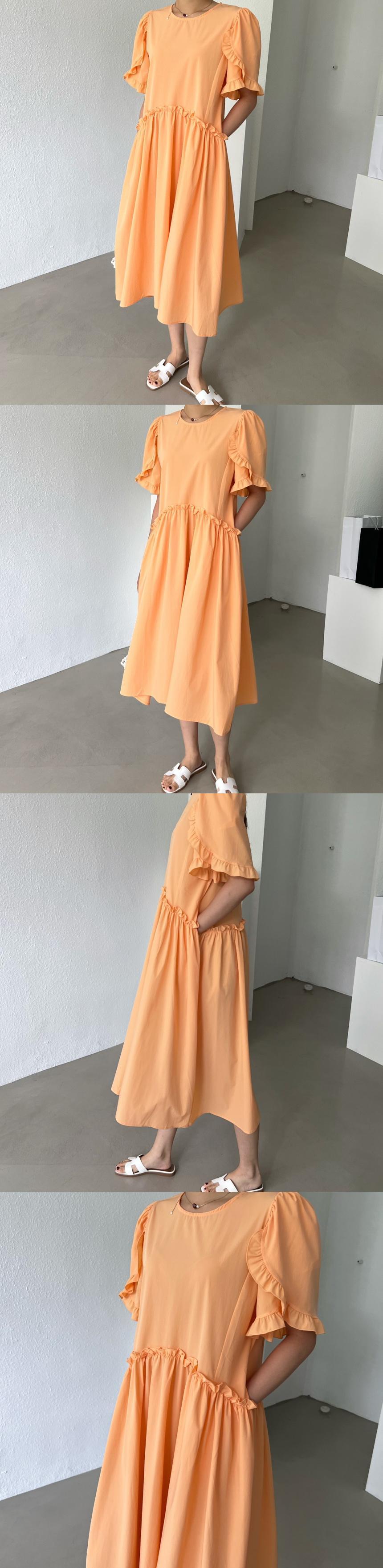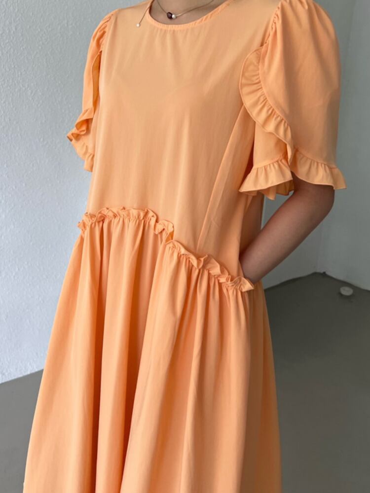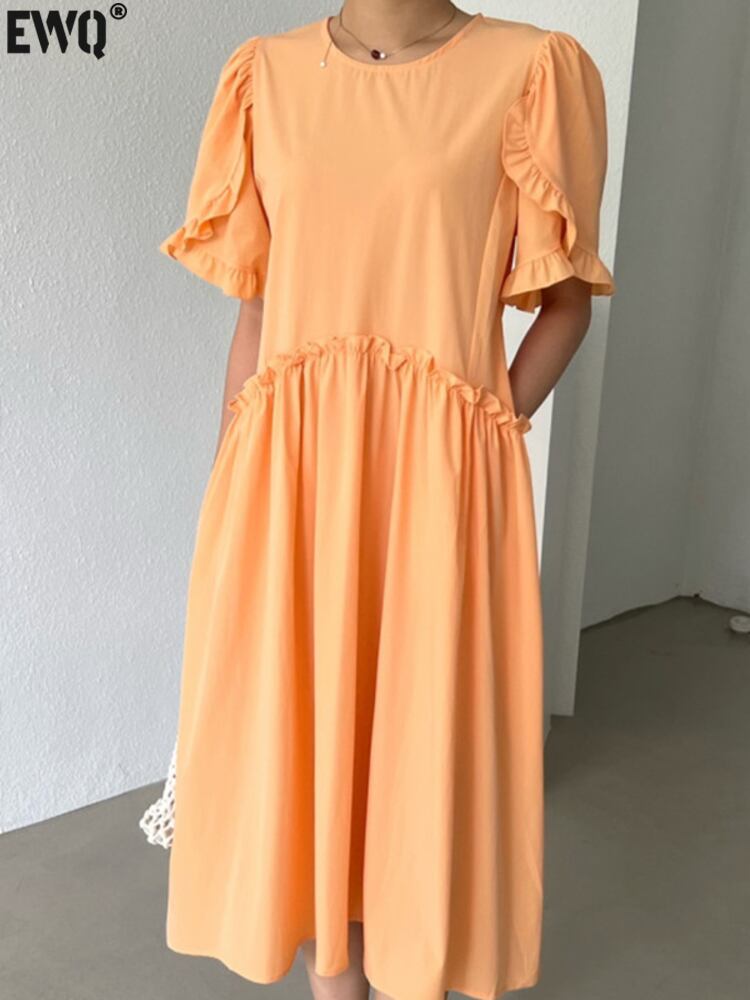 [EWQ] 花びらスリーブソリッドカラーパッチワークドレスプリーツウエストルーズフリルスプライスドレス夏潮 Vestido 234 サマー 夏物
