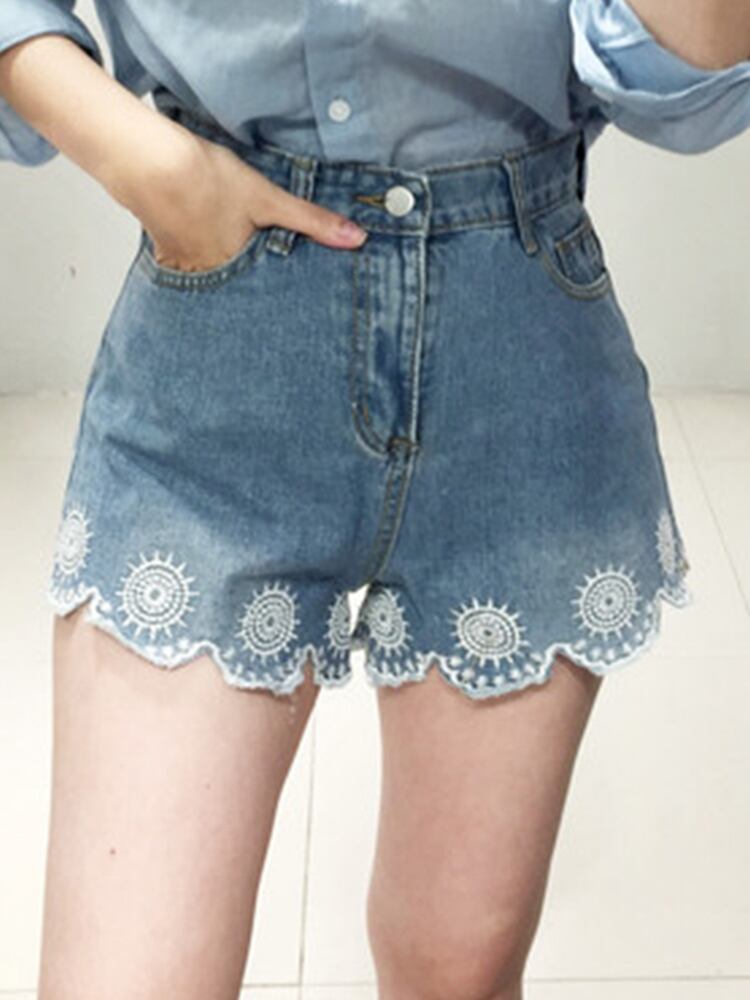 [EWQ] フックフラワーコントラストデニムショートパンツポケット刺繍レースワイドレッグショートジーンズ夏潮 16Y9036 レッド サマー 夏物 ショーツ ブルマー ワイドパンツ フラワーデザイン
