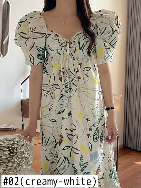 [EWQ] スクエアネックレースアップボウドレスコントラストカラープリントバブルスリーブドレス夏潮 Vestido 6Y9292 リボン サマー 夏物 スクウェア