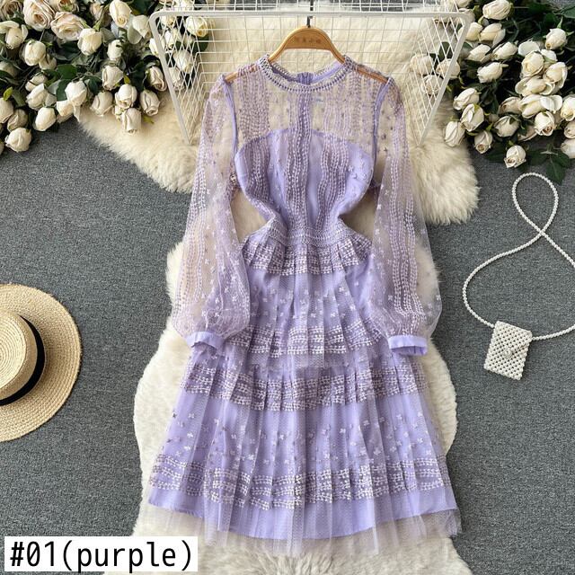 [EWQ] レースメッシュフックフラワードレス甘い気質ランタンスリーブパープル O ネックドレス夏 Vestido 16Y9376 大人ガーリー スウィート キュート カジュアル サマー 夏物 Oネック フラワーデザイン