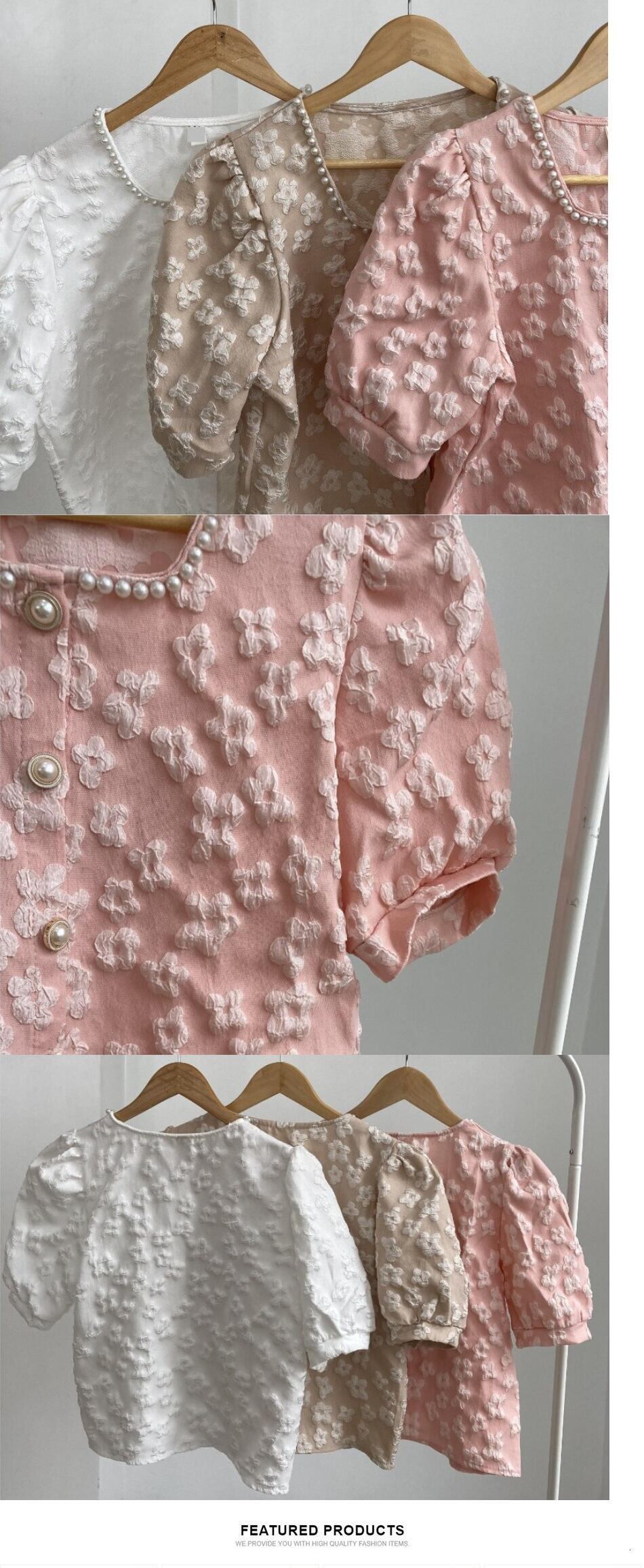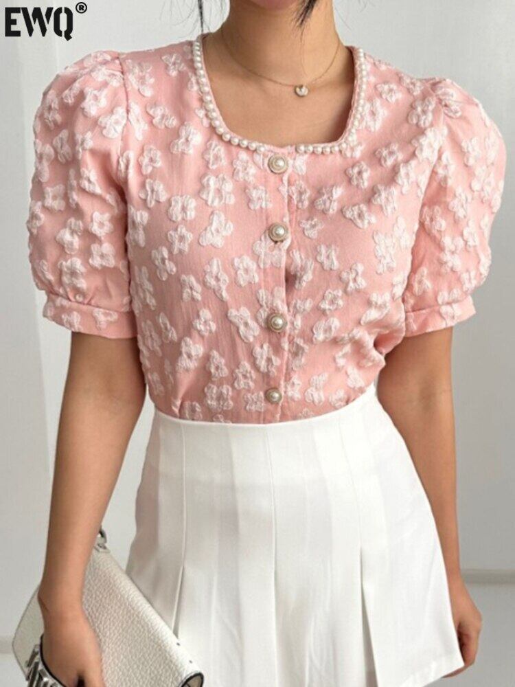 [EWQ] 甘いスクエアネックパールスプライシングシャツパフスリーブジャカードピンクブラウストップ夏潮トップス 16Y8708 大人ガーリー スウィート キュート カジュアル サマー 夏物 真珠 スクウェア