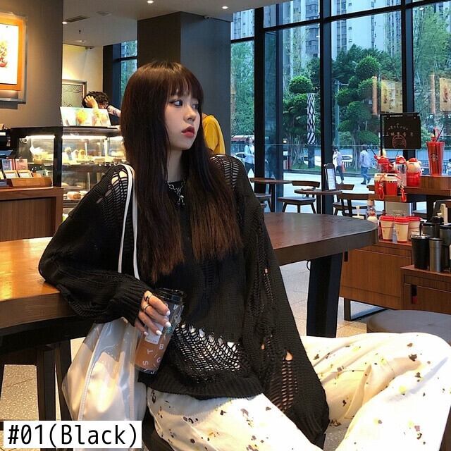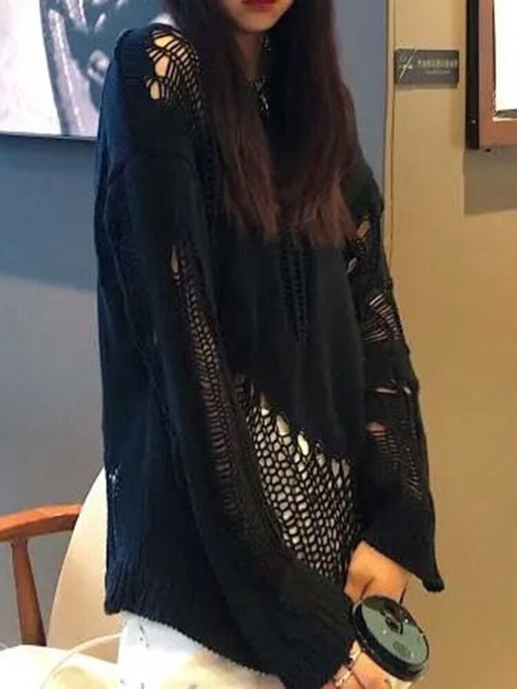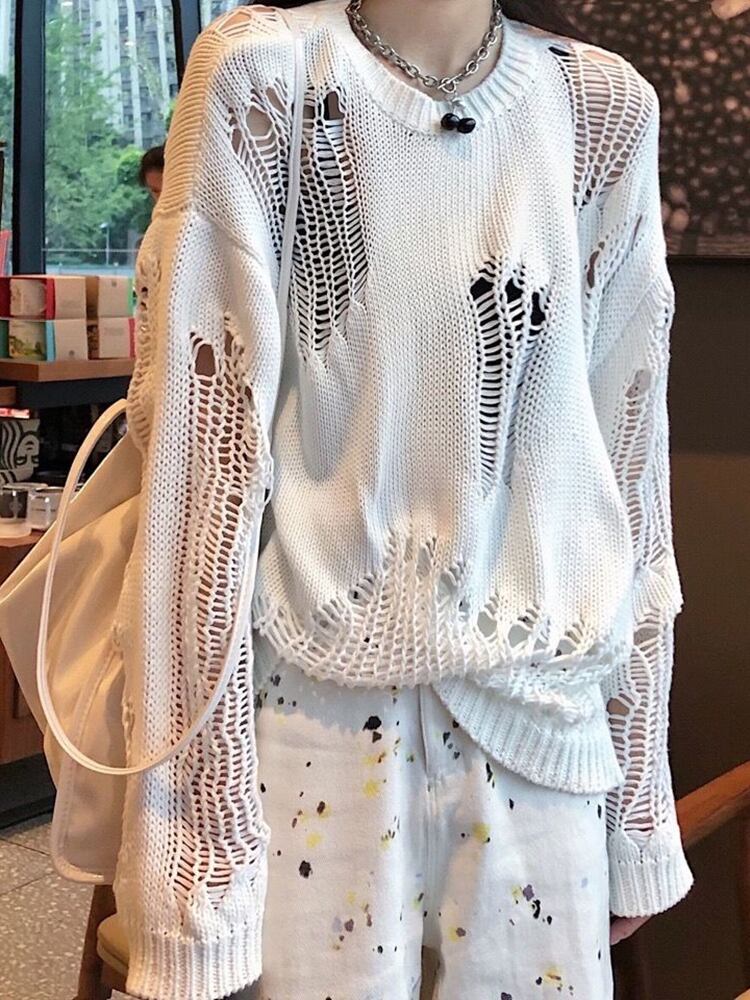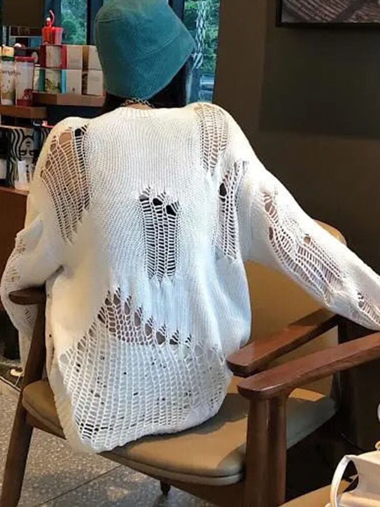 [EWQ] 不規則中空アウトストリート薄いセーター夏潮長袖薄いプルオーバーニットトップ 11 ロング サマー 夏物