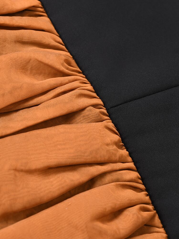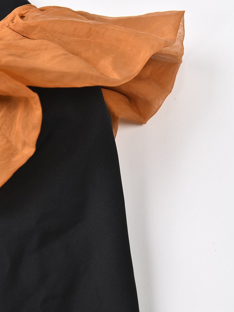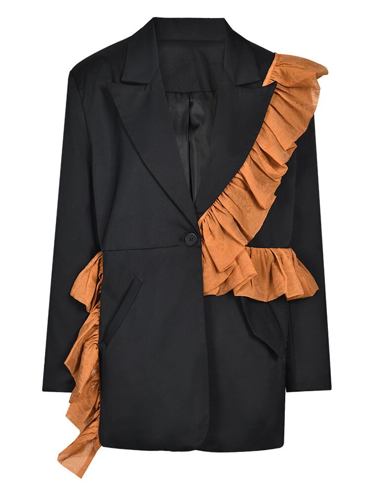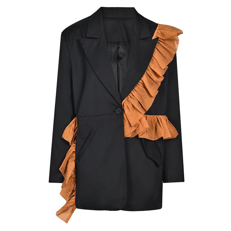 [EWQ] 春秋黒フリルビッグサイズ不規則ブレザーラペル長袖ルーズフィットジャケットパッチワークトップ ロング ブラック ラッフル スプリング 春物 オータム 秋物
