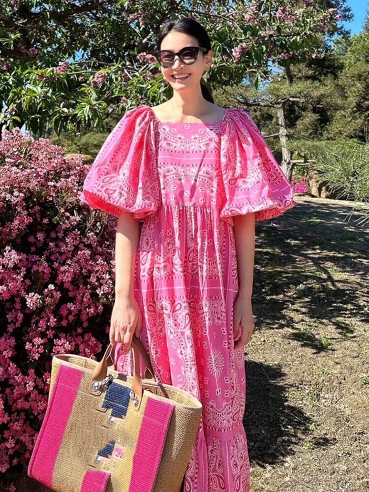 [EWQ] プリントルーズドレスコントラストカラースクエアネックバブルスリーブドレスサマータイド Vestido 夏物 スクウェア