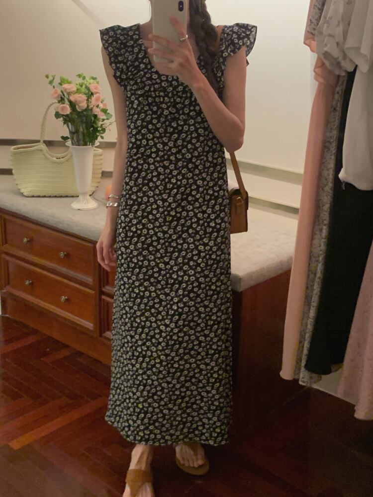 [EWQ] O ネック花柄コントラストカラードレスフリルスプライスノースリーブレースアップドレス夏潮 サマー 夏物 Oネック