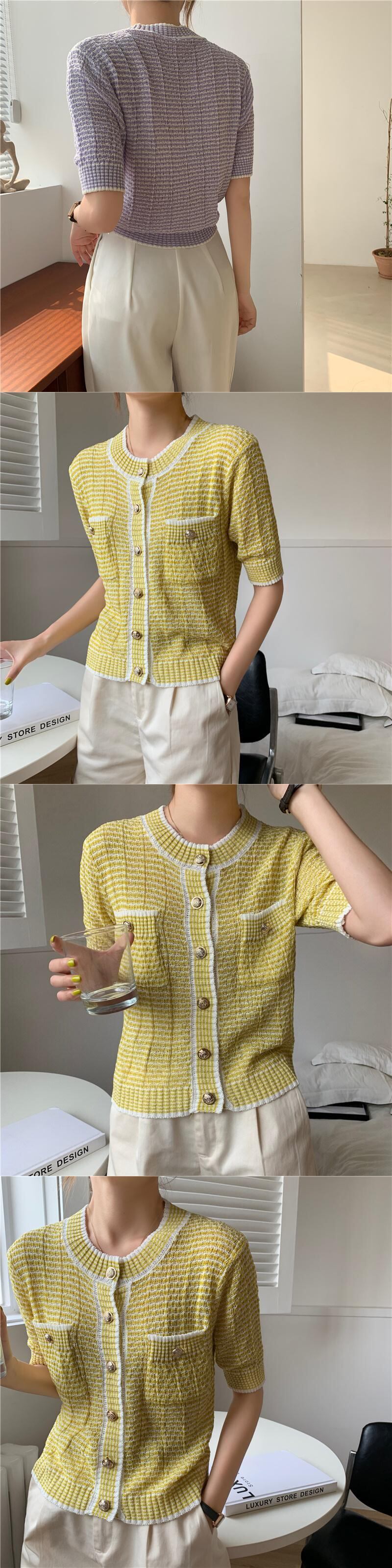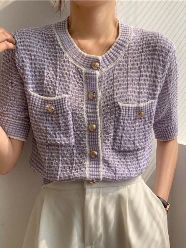 [EWQ]メタルボタンOネックシャツ半袖ポケットコントラストカラーニットブラウストップスサマートップスY8446 ショート ハーフスリーブ 夏物