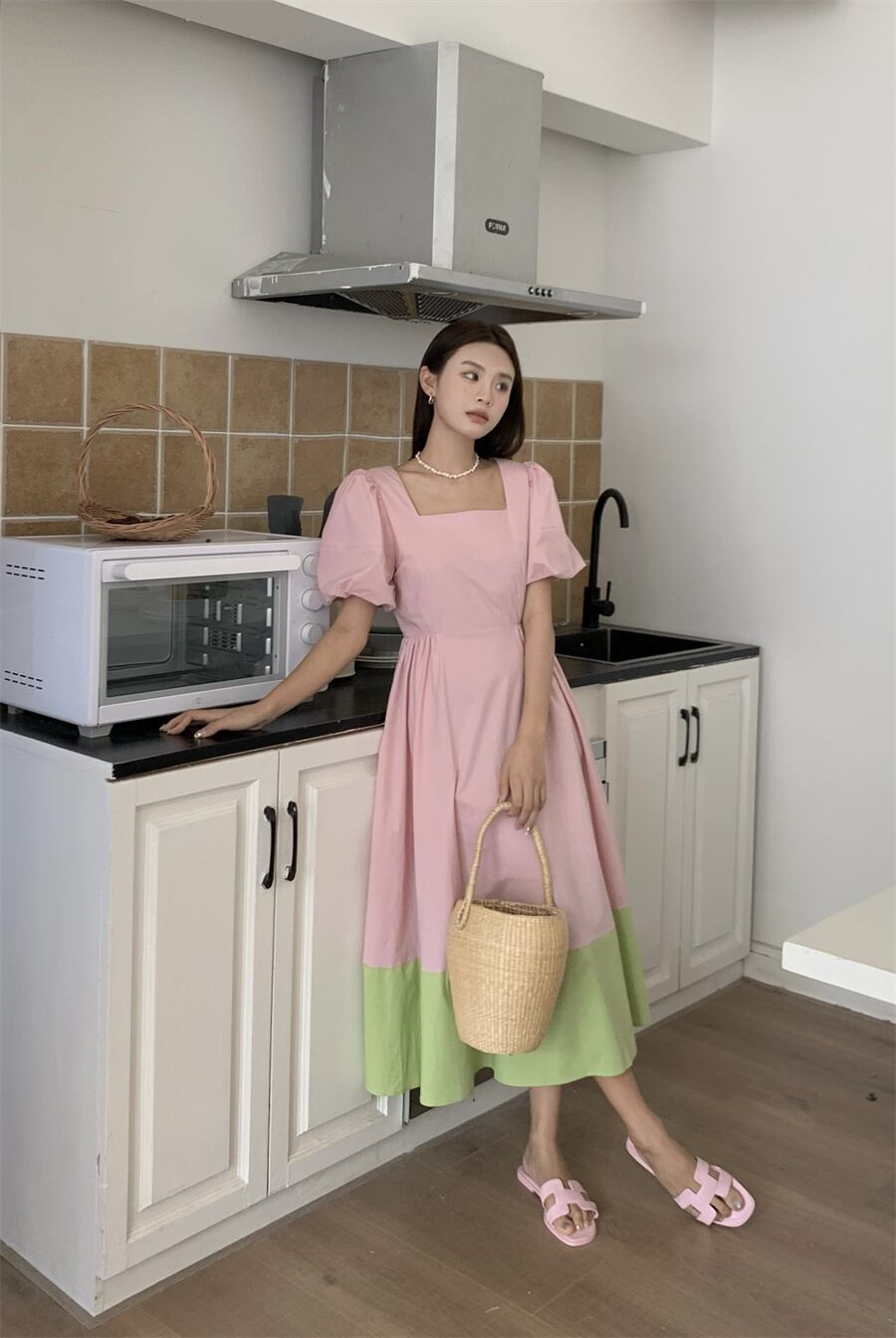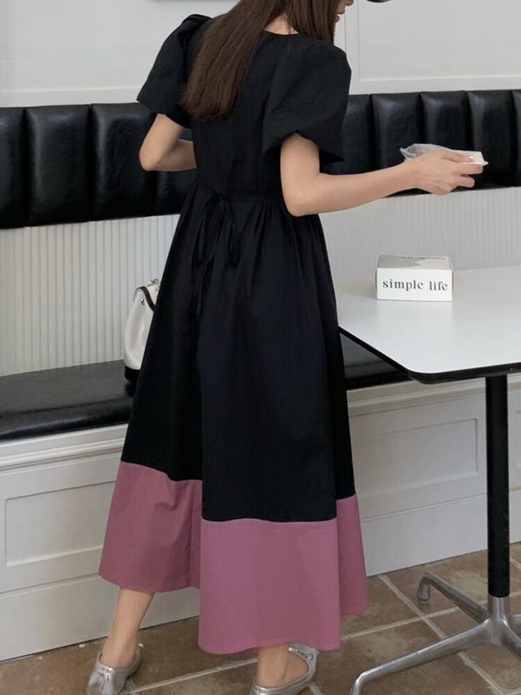 [EWQ] スクエアネックカラーコントラストドレスプリーツウエストパフスリーブドレスサマータイド Vestido 9440 夏物 スクウェア