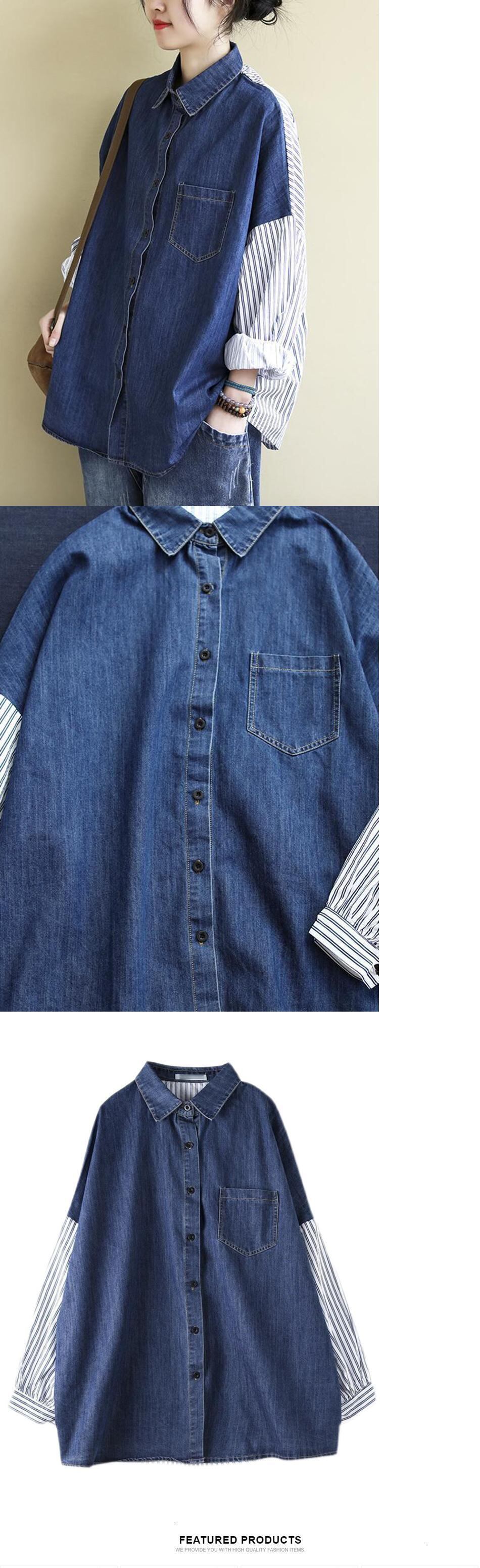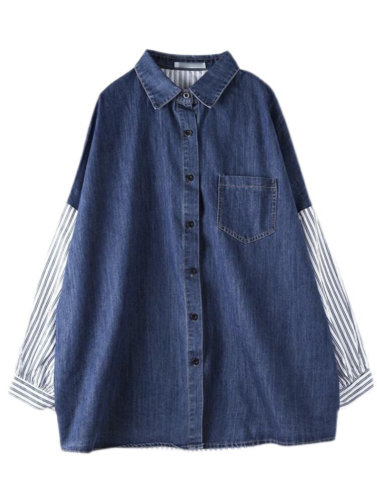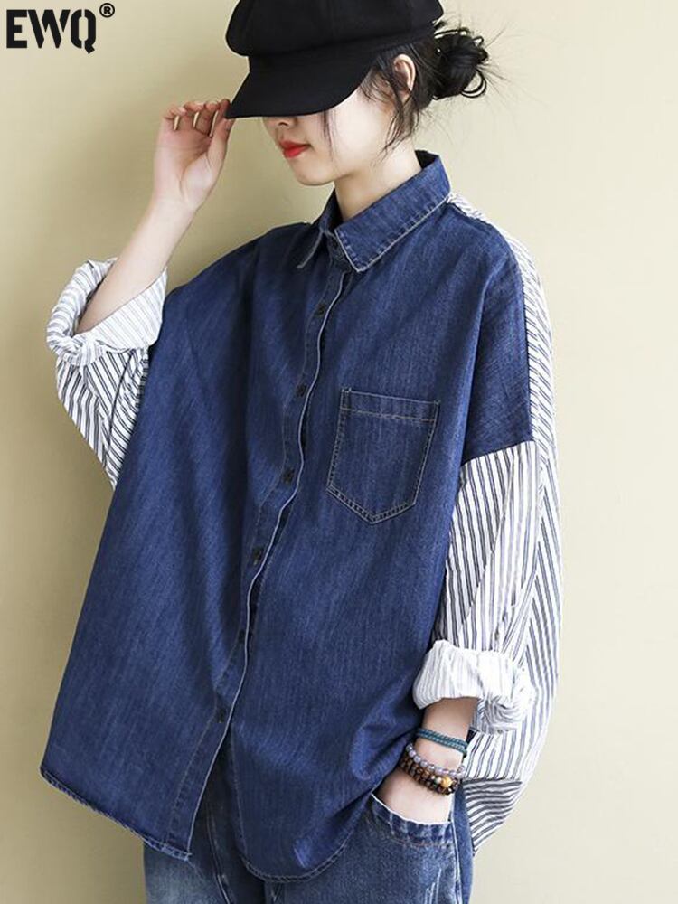 [EWQ] ビッグサイズバックレターストライプシャツ長袖パッチワークシングルブレストコントラストサマートップ ロング 夏物