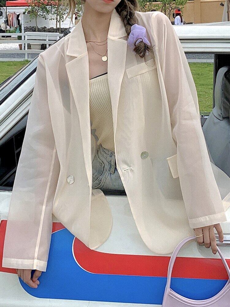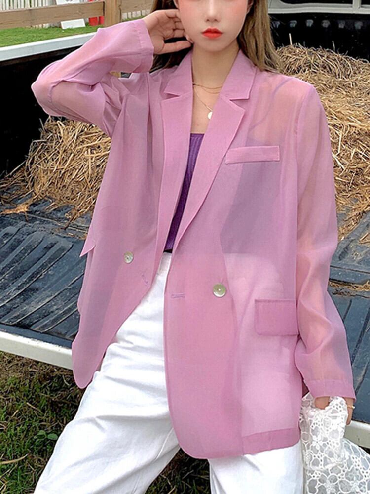 [EWQ] スウィートピンクジャケット長袖視点 1 ボタンジャケットコート春夏潮緩いカジュアル生き抜く ロング 大人ガーリー キュート スプリング 春物 サマー 夏物
