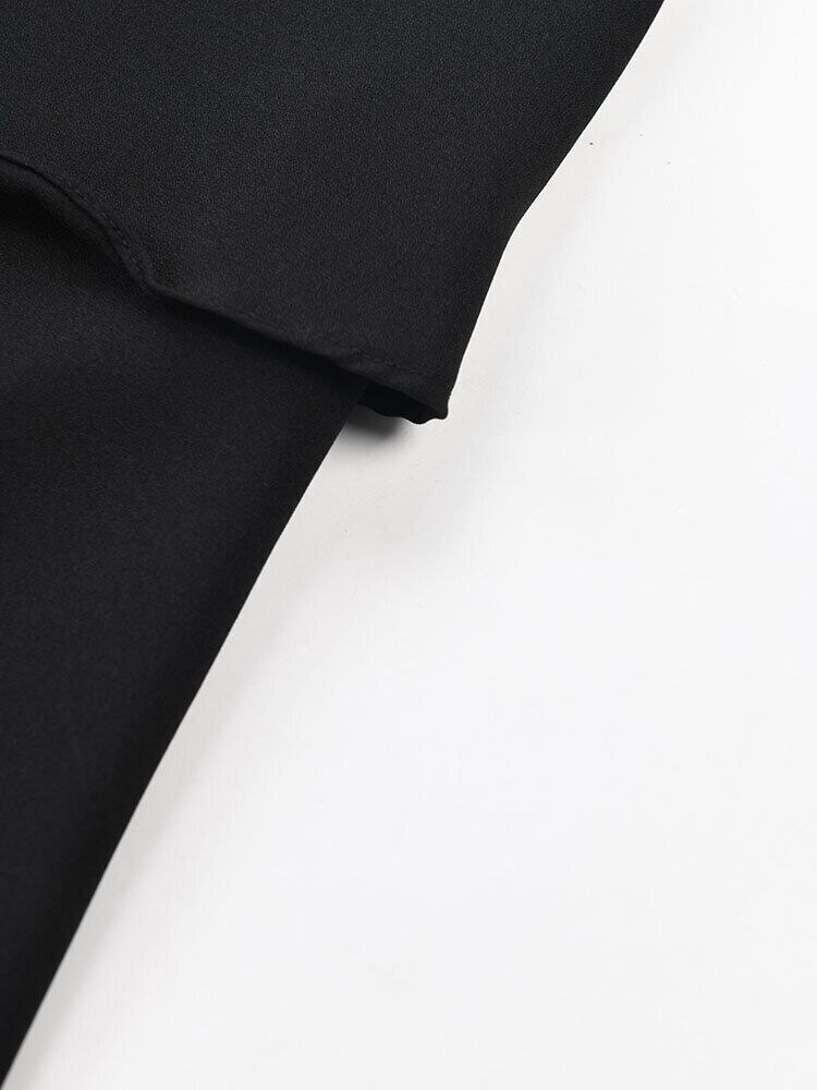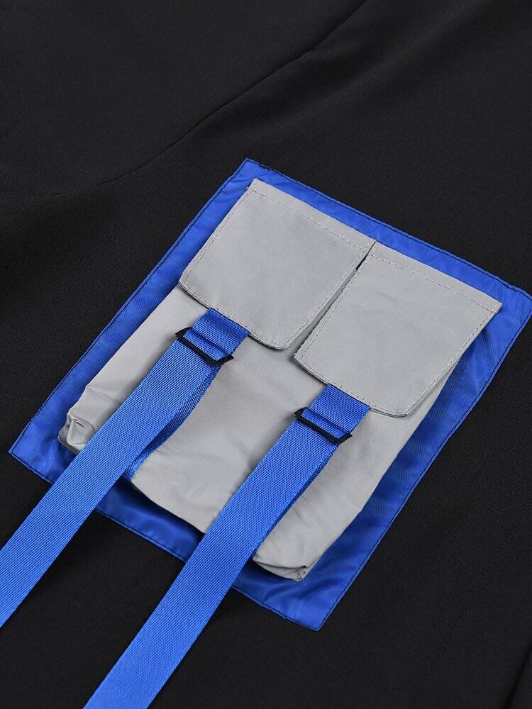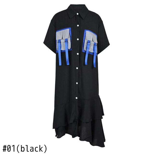 [EWQ] ブラックリボンドレスパッチワークポケットビッグサイズ不規則ローブラペル半袖ルーズフィット夏 ショート ハーフスリーブ サマー 夏物
