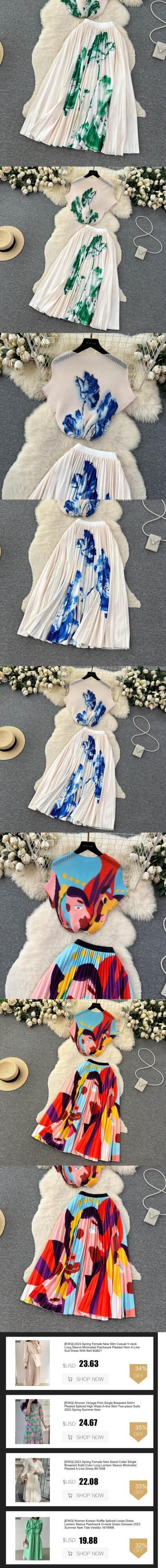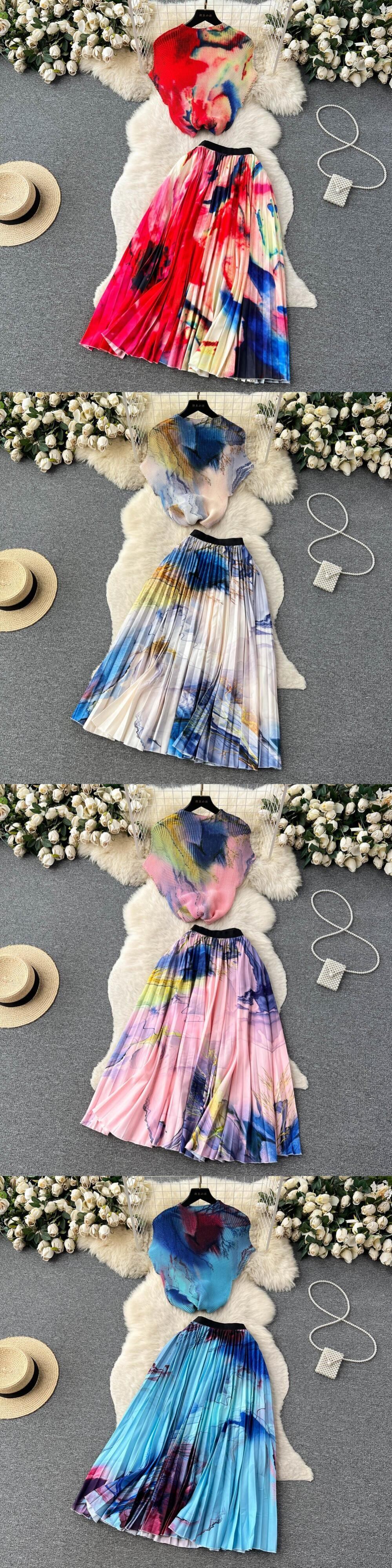[EWQ] タイダイプリントセット夏ハーフネックトップ + プリーツコントラスト A ラインスカートスーツ 30 色 サマー 夏物 Aライン