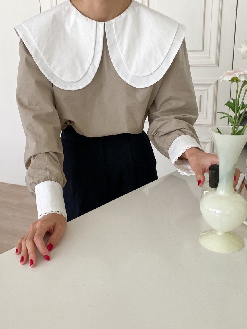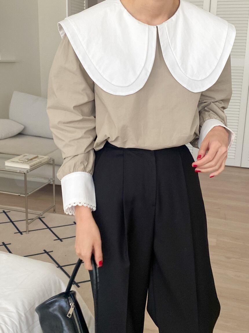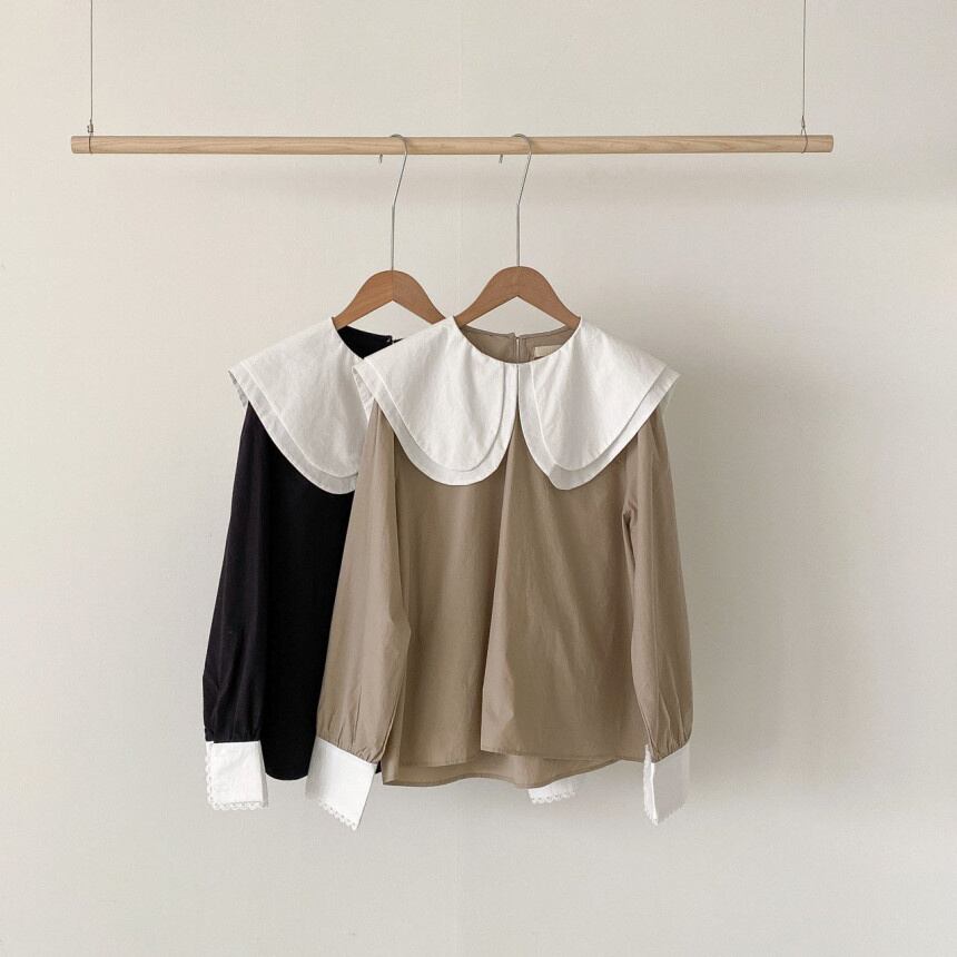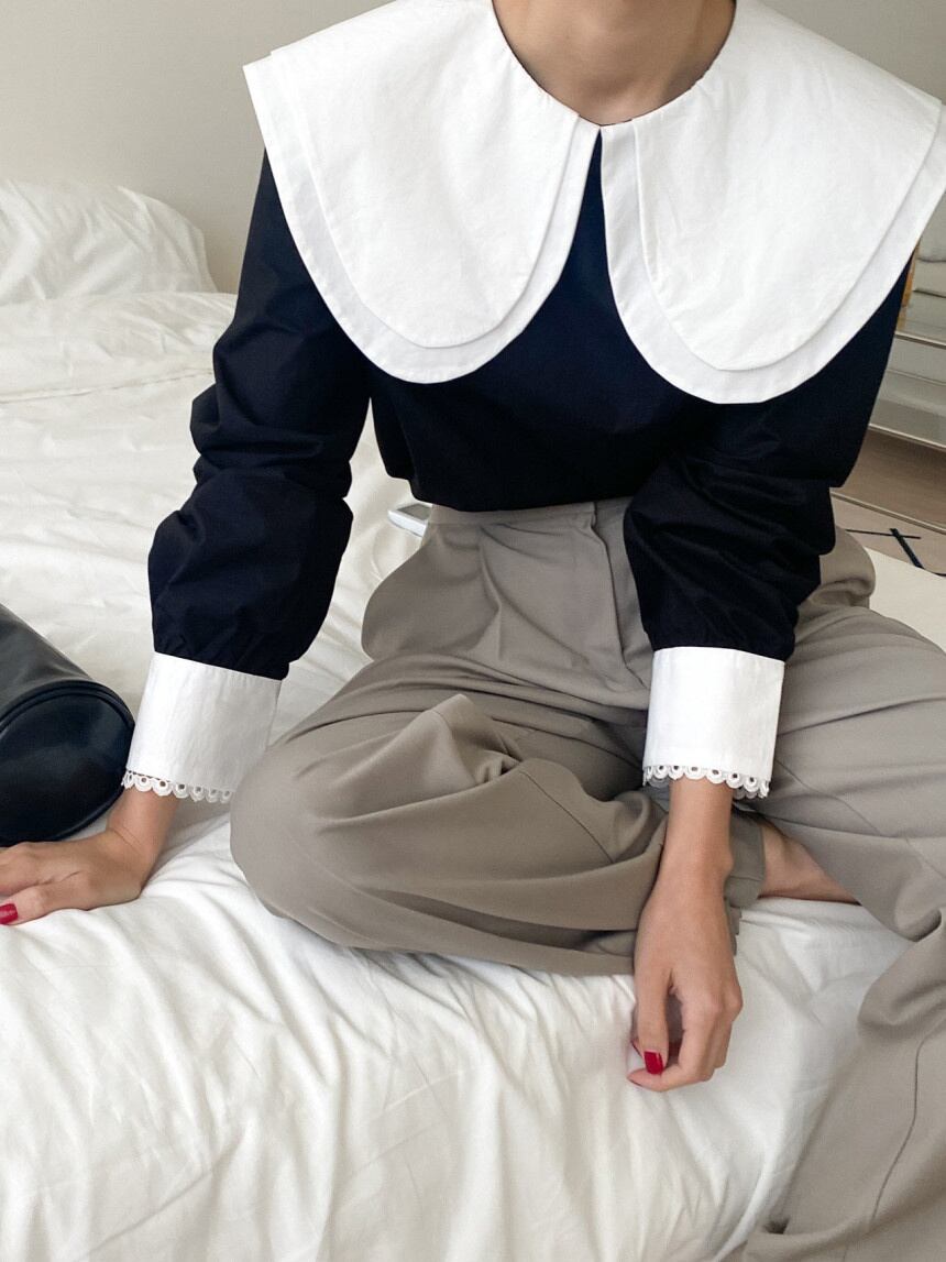 [EWQ] ピーターパンカラーコントラストシャツ長袖パッチワークルーズカジュアルブラウス夏潮 16Y8790 ロング サマー 夏物
