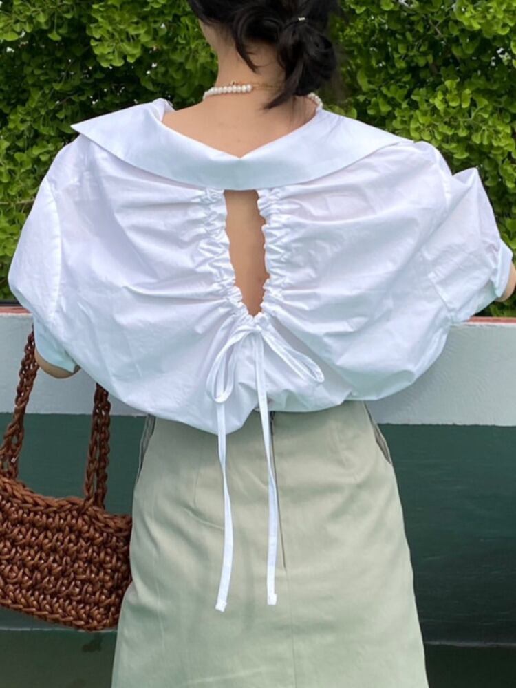 [EWQ] バック中空アウトレースアップシャツパフスリーブラペルルーズカジュアル夏潮シングルブレストトップ サマー 夏物