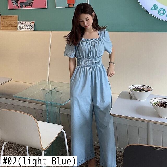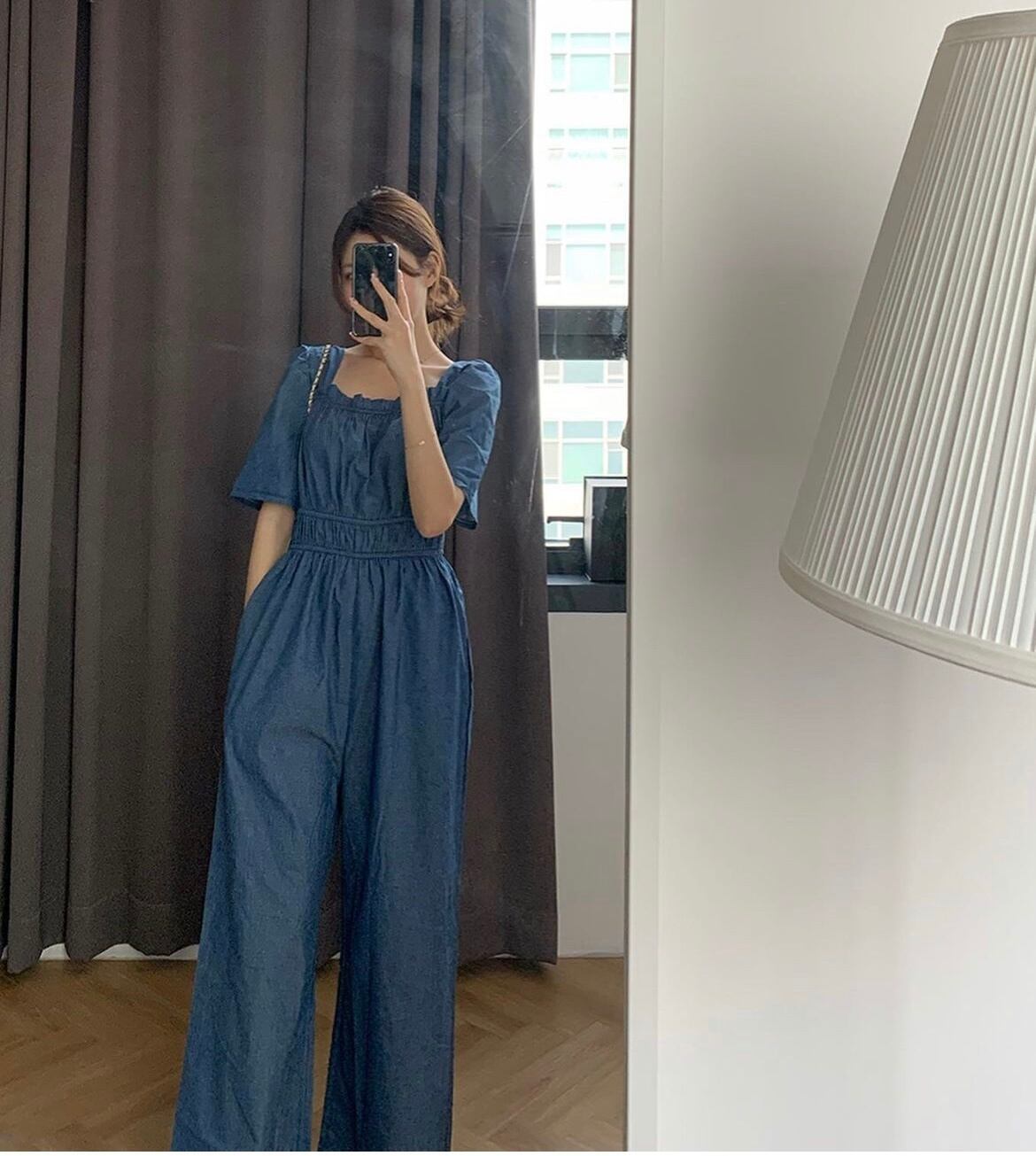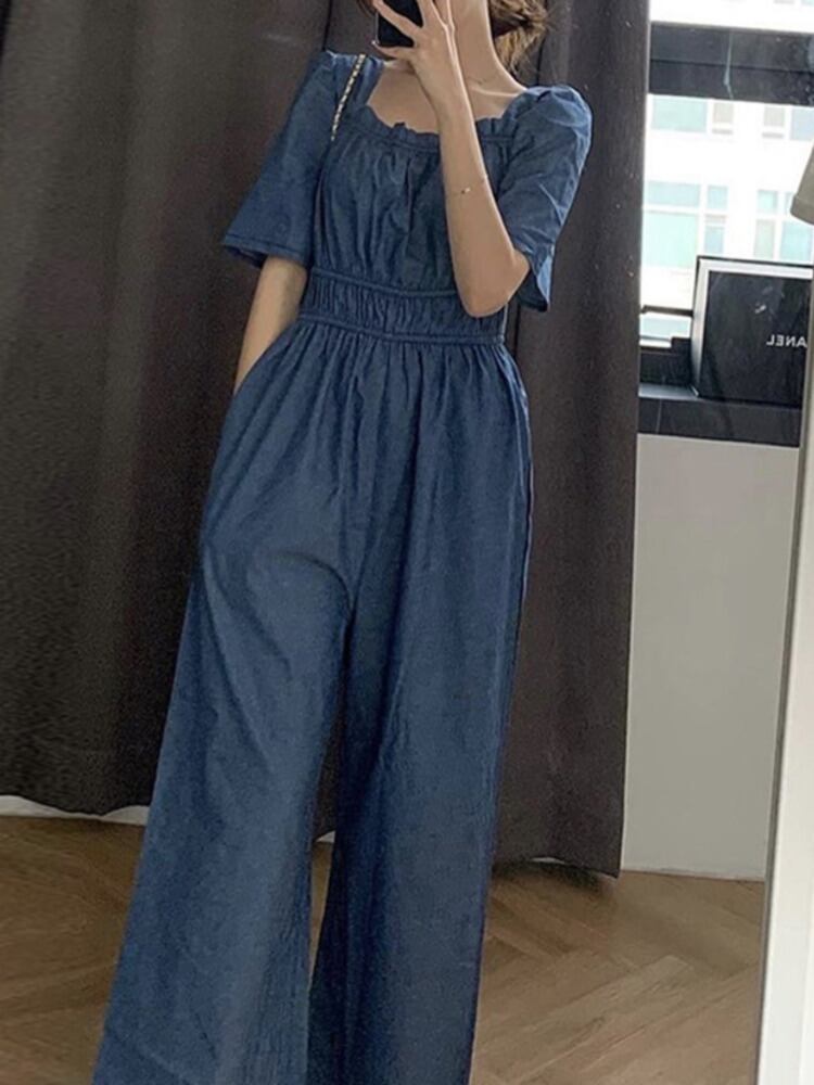 [EWQ] 遊び着スクエアネック弾性ウエストプリーツワイドレッグデニムジャンプスーツ夏潮ストリート エラスティック 伸縮 サマー 夏物 ワイドパンツ スクウェア