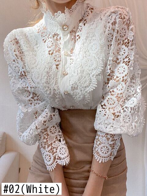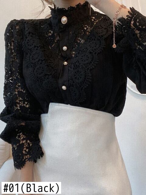 [EWQ] 花びら袖スタンドカラー中空フラワーレースパッチワークシャツ春夏レディースレースブラウスボタントップ スプリング 春物 サマー 夏物 フラワーデザイン