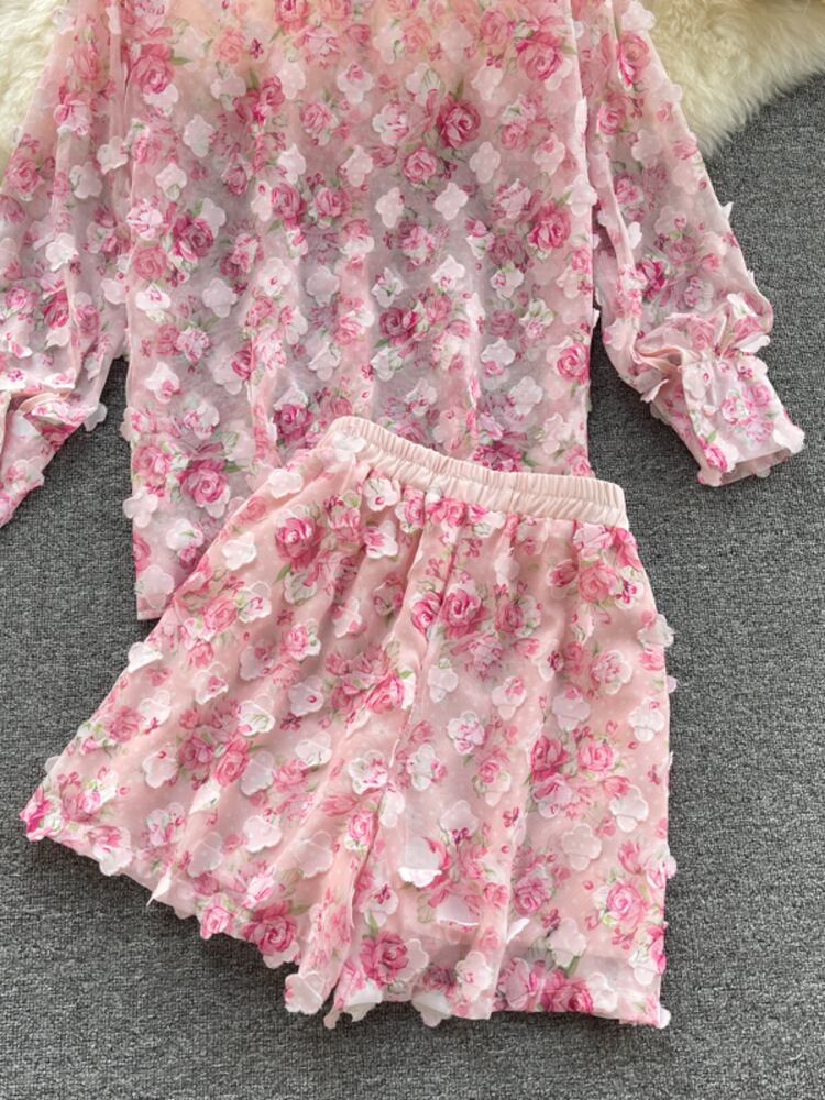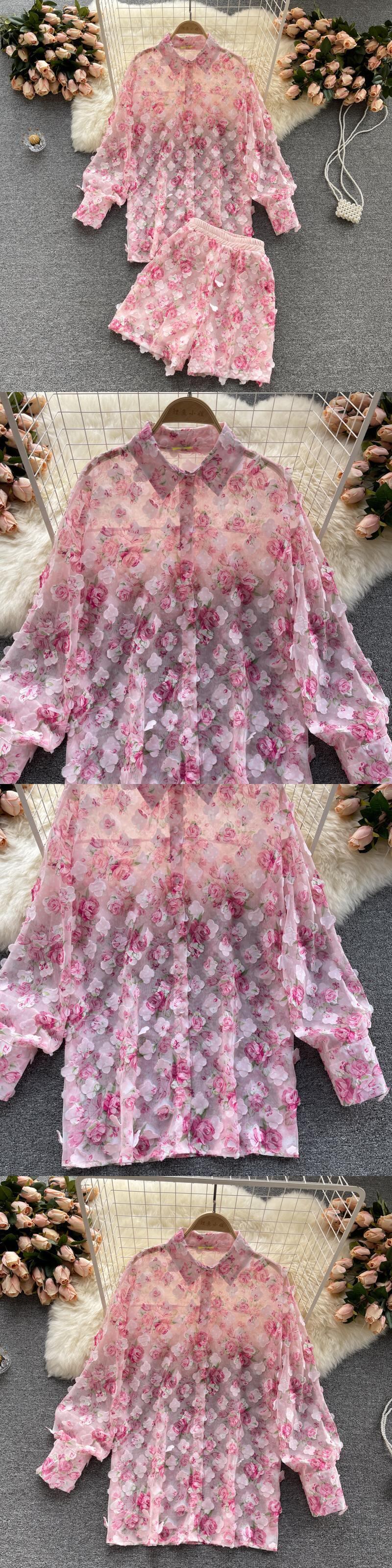 [EWQ] 3D フラワースイートスーツ遠近シングルブレストシャツ + ウエストコントラストショーツ夏潮セット 16Y9370 大人ガーリー スウィート キュート カジュアル サマー 夏物 ブルマー フラワーデザイン