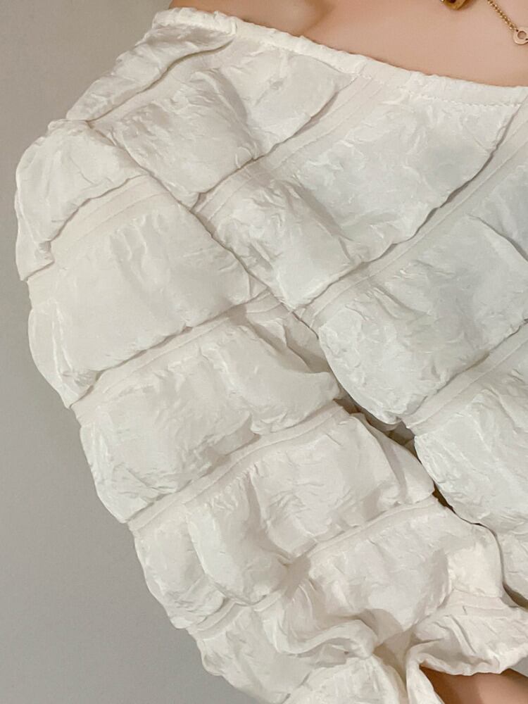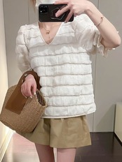 [EWQ] 甘いシャツ V ネックプリーツパフスリーブルーズカジュアルトップ夏美しいトップ潮ブラウス 9398 大人ガーリー スウィート キュート サマー 夏物 Vネック