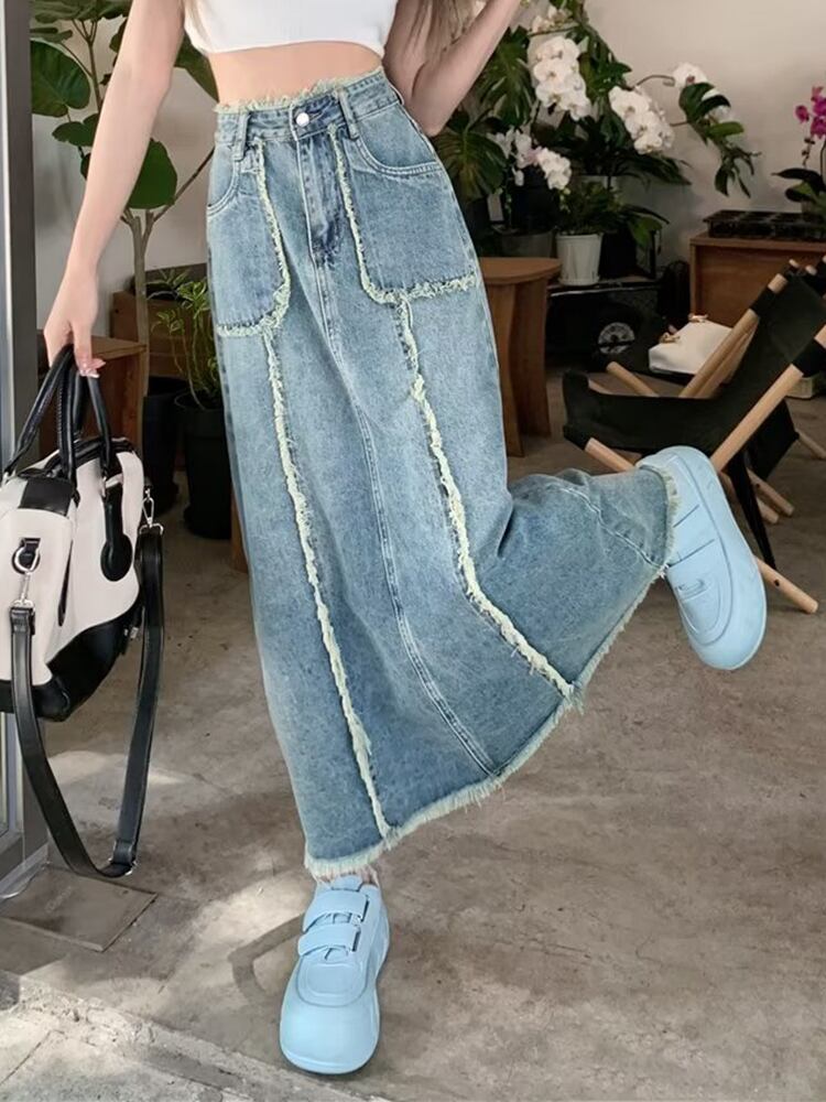[EWQ] ストリートパッチワークデニムスカートウエストポケットスプライステルストレートスカート夏潮ファルダス サマー 夏物